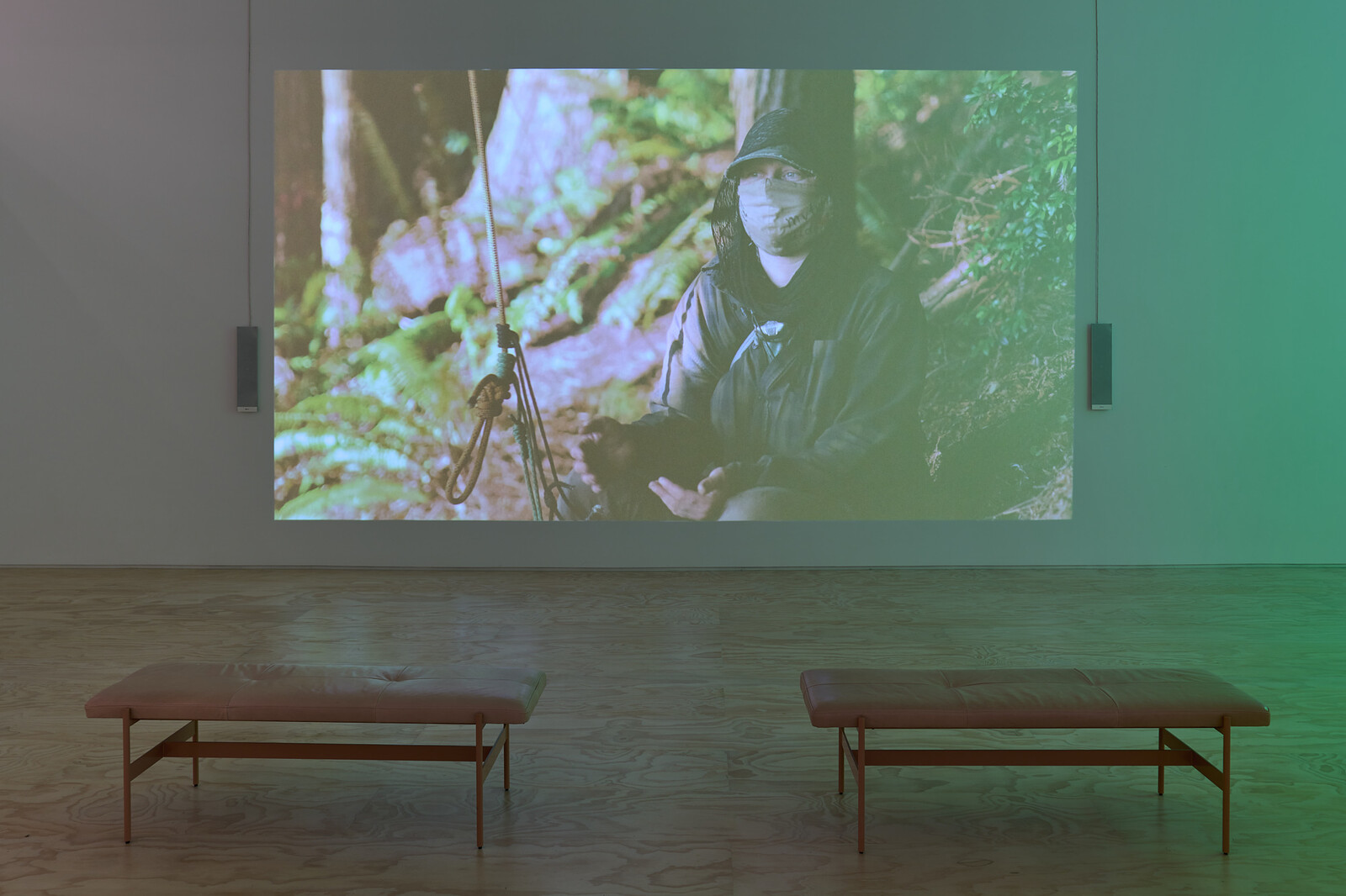 Facing these representations of grief from across the room, Bowers’s 2022 video Landscapes We Call Home, Redwood Forest Defense, 2020 documents activism countering further loss of life. While avowedly less belligerent than groups such as Extinction Rebellion and Earth Liberation Front, members of the Redwood Forest Defense, shown embedded high in the canopy of redwood trees in Northern California, militantly oppose not only the clear-cutting lumber industry but prevailing extractivist ideologies that support such rapacious commercial methods. Projected larger-than-life, these activists put forward the emphatic yet nuanced analyses that can only be generated through experiences of life outside conventional society. The direct address to viewers by protesters who put their own bodies out there makes these revolutionaries—and revolution itself—seem not only reasonable but acutely necessary to protect individual trees while intervening in a deeply flawed social order generated by capitalism.