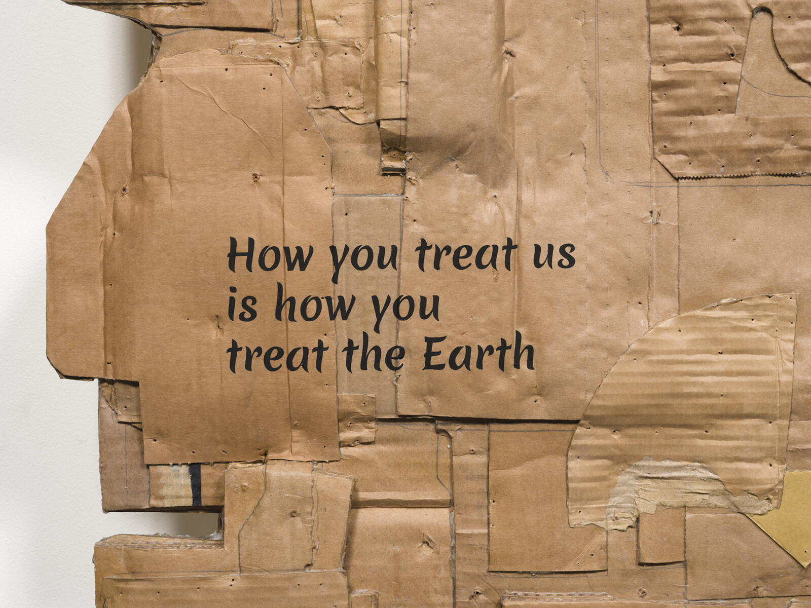 Cardboard, in these irregular, intensely pieced-together panels, becomes more than mere background for the figures. Instead, it’s insistent in its own textures and the committed weaving together of numerous fragments of repurposed paper products—recycling as manifesto against unquestioning modes of resource extraction, accumulation, and monumentality. Bowers’s use of cardboard as more than a material base points to her longstanding work around safeguarding old-growth trees, the living beings from which this manufactured packaging material derives.