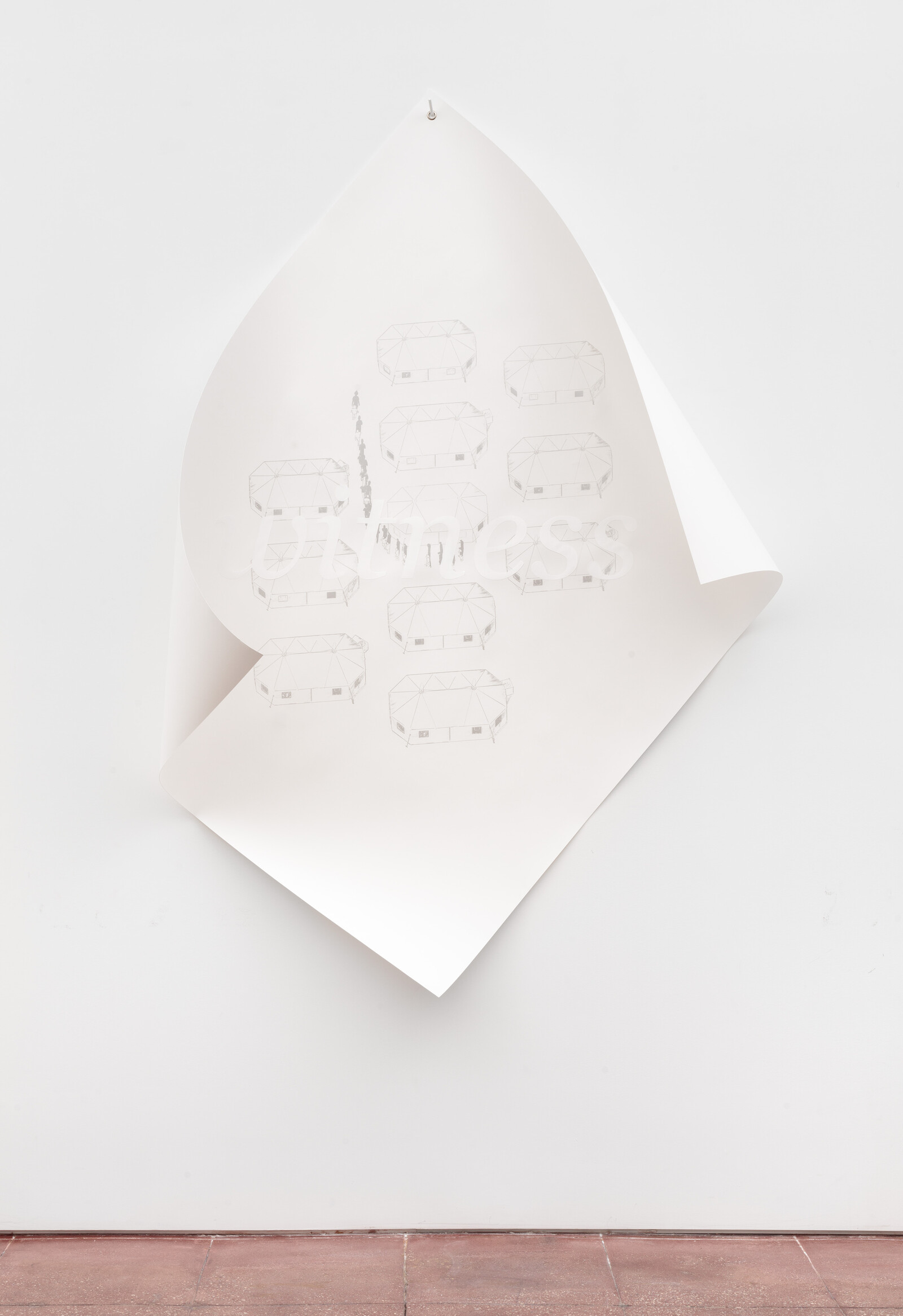 Two recent silkscreens, which give the exhibition its title, “On this day,” are easily overlooked. Hanging on separate walls in the back of the room, they are large, square sheets of white paper, the corners curling forward, their form and color echoing the slide projections. One of them, On this day (after Erin Schaff: Christine Blasey Ford testified before the Senate Judiciary Committee to address Dr. Blasey’s sexual assault allegation against the Supreme Court nominee Judge Brett Kavanaugh. September 27, 2018) (2019) is a portrait of Christine Blasey Ford, and reads “Witness.” The other, On this day (after Mike Blake: Immigrant children, many separated from their parents, are being housed in tents in Tornillo, Tex., near the Mexican border. June 2018) (2019) depicts 11 similar tents clustered together, with the “Witness” embossed in white in the center of the composition. Geyer’s intention is ambiguous. The most obvious interpretations are redundant indicators of political engagement that barely match the complexity of the artist’s practice. Perhaps the historical specificity of the depicted events is intended to call attention to the present, or rather make viewers aware that they are entangled in a historical continuum of trauma and injury. As Chantal Akerman’s films exemplify, the present is always haunted by the past, and marked by a promise to weigh on the future.