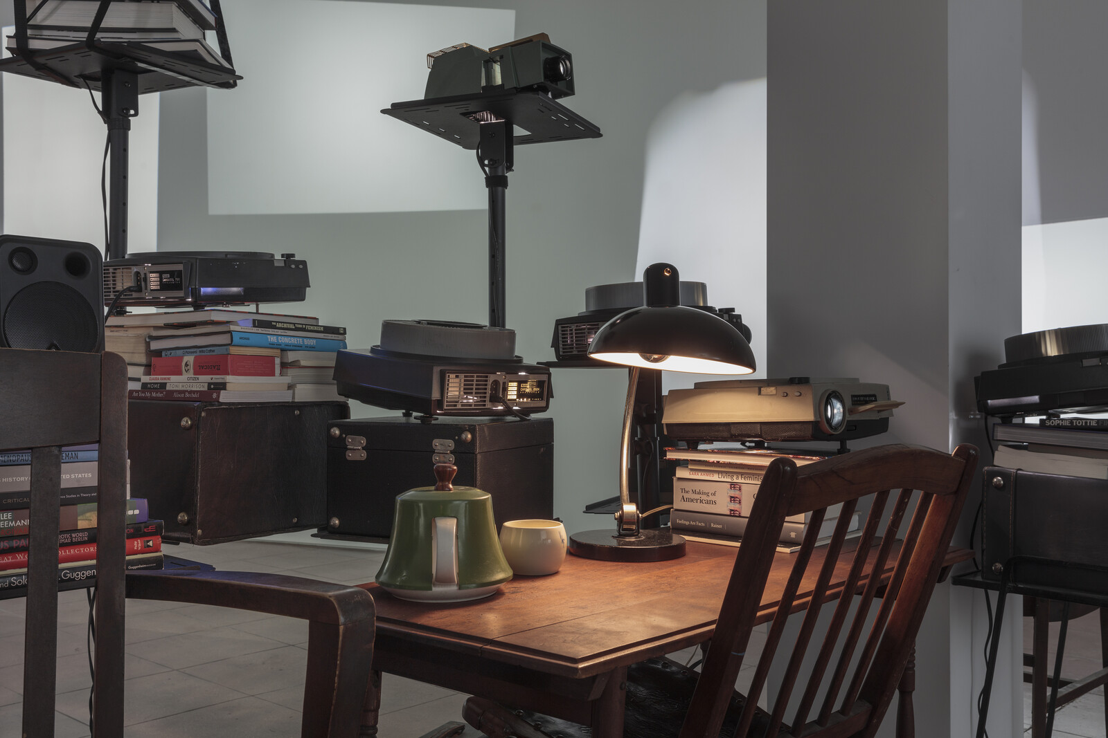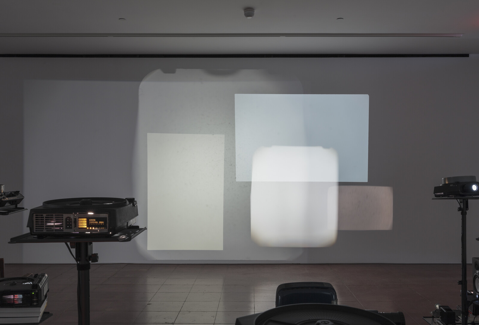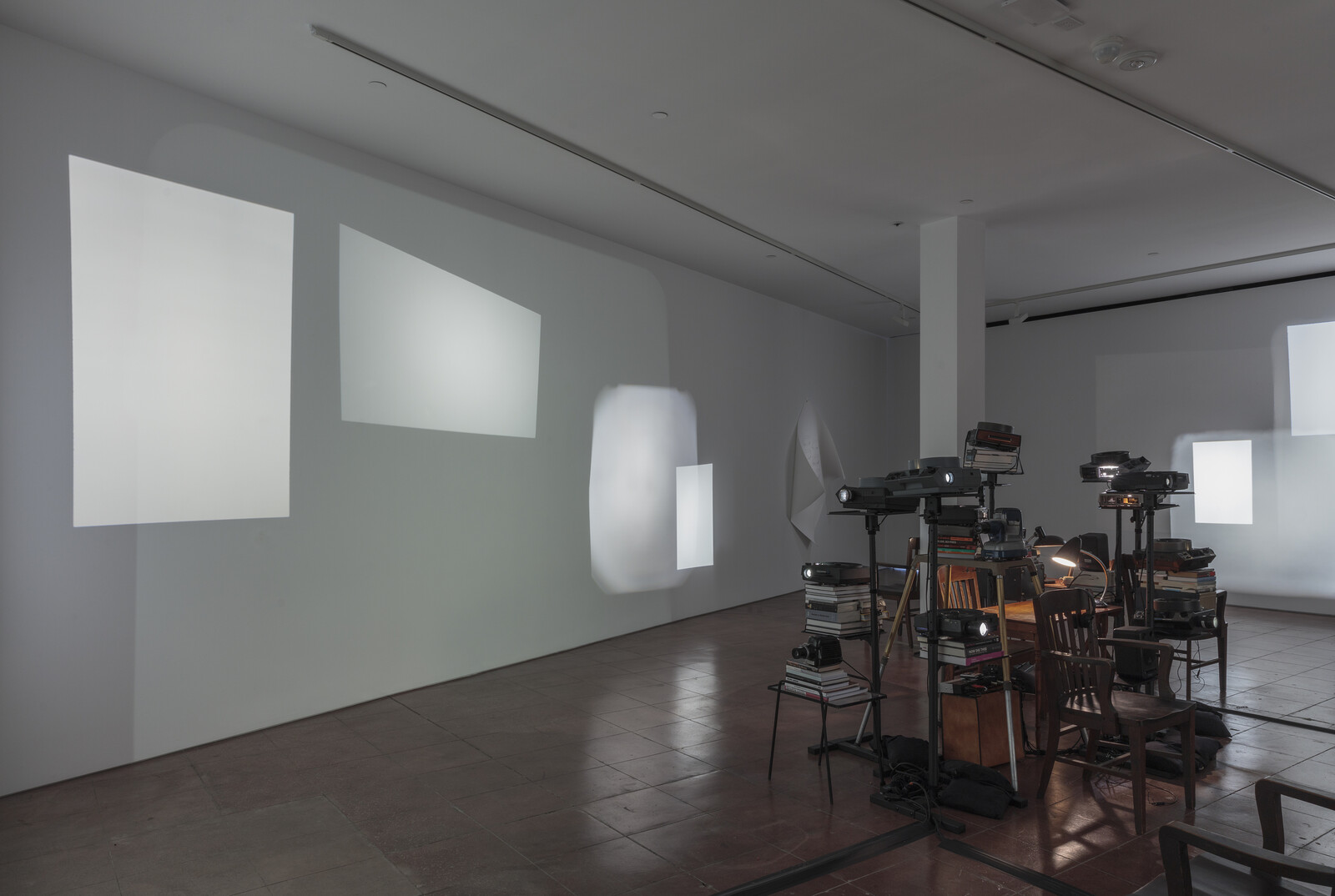 A series of slide projectors are supported by stacks of books and pieces of wooden furniture. The space is darkened, only illuminated by streams of light exuding from the projectors, as well as the images they produce: a range of abstract squares and rectangles in various shades of white that linger on the walls in a quiet rhythm. From a handful of speakers spread across the room, a recording is transmitted, with the sound of the artist’s voice, speaking English with a subtle German accent.