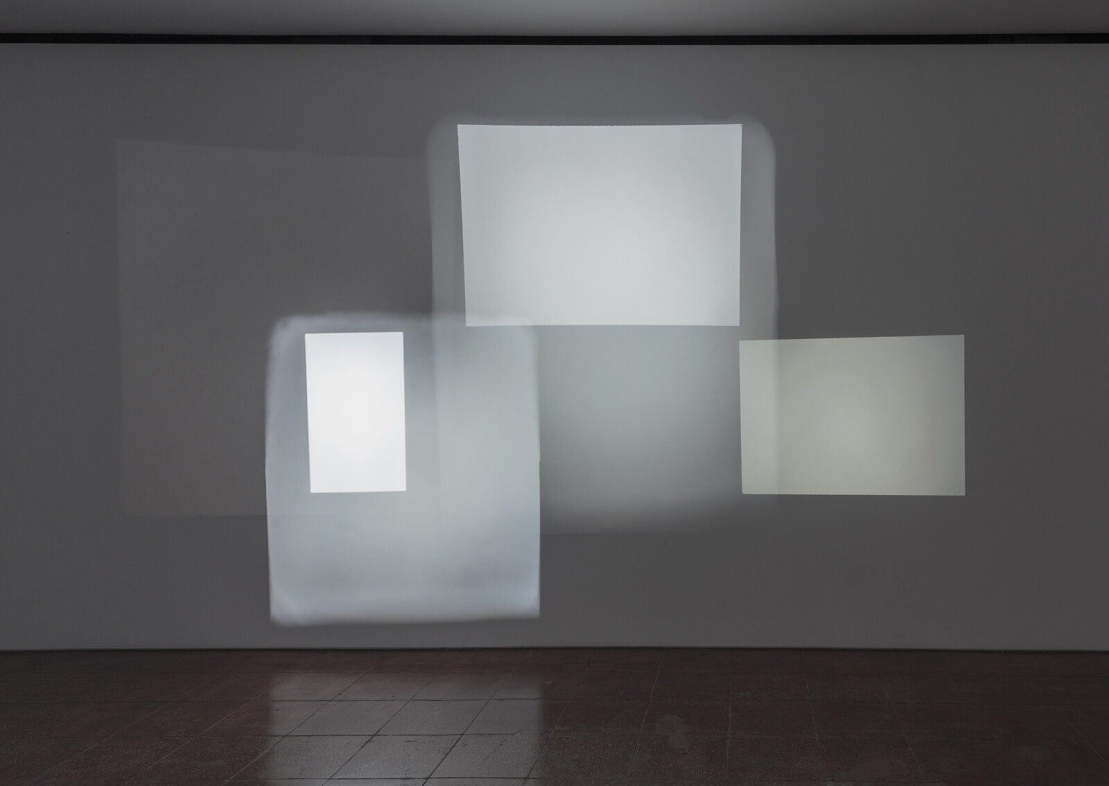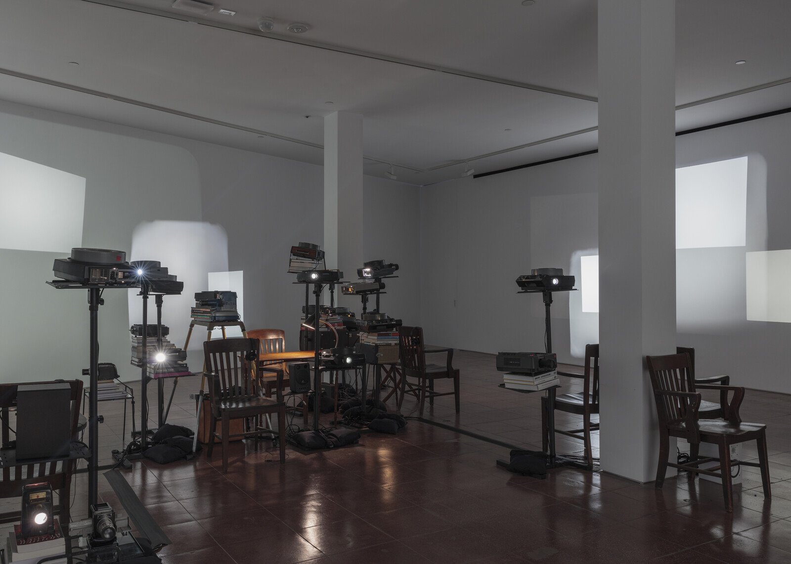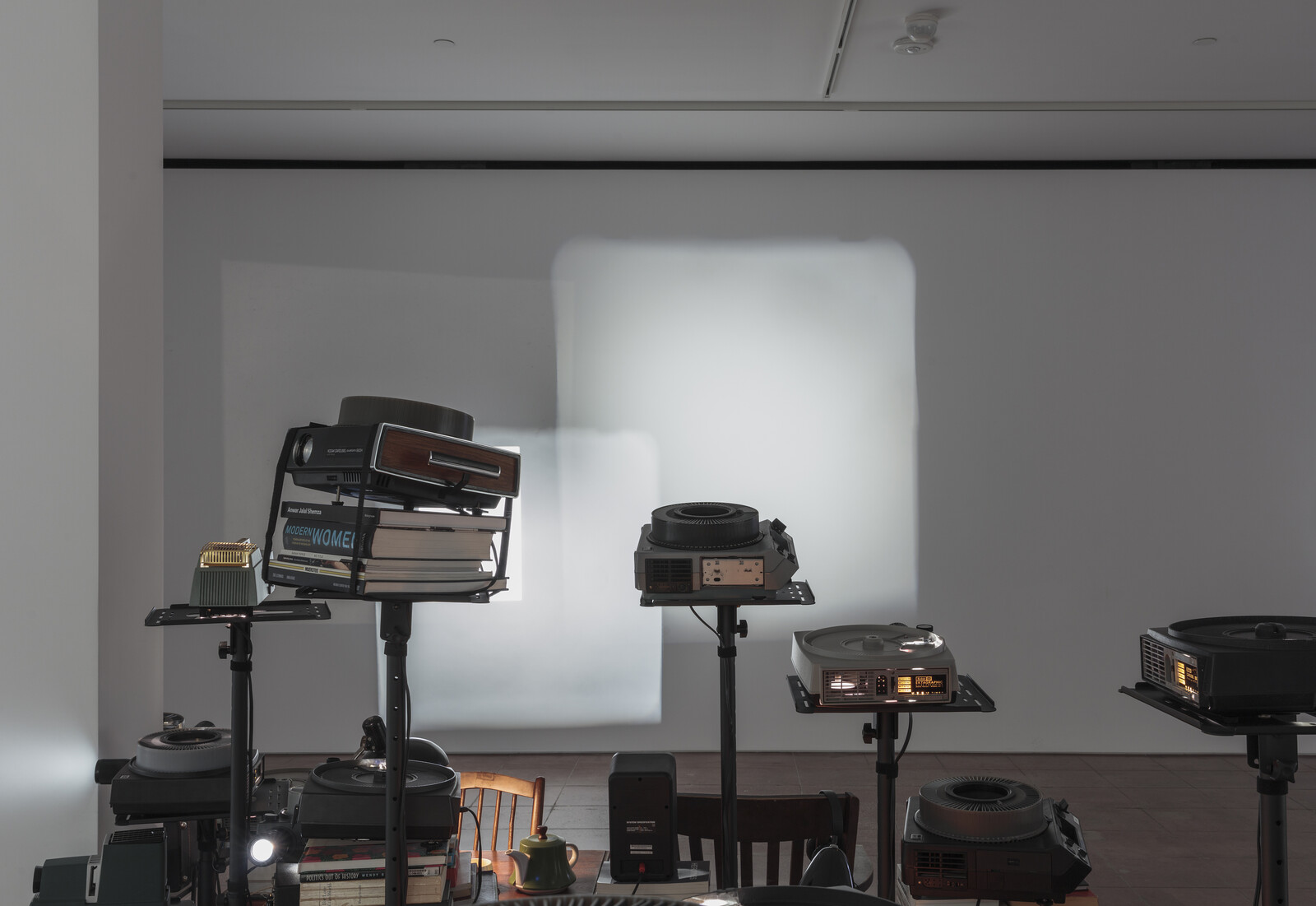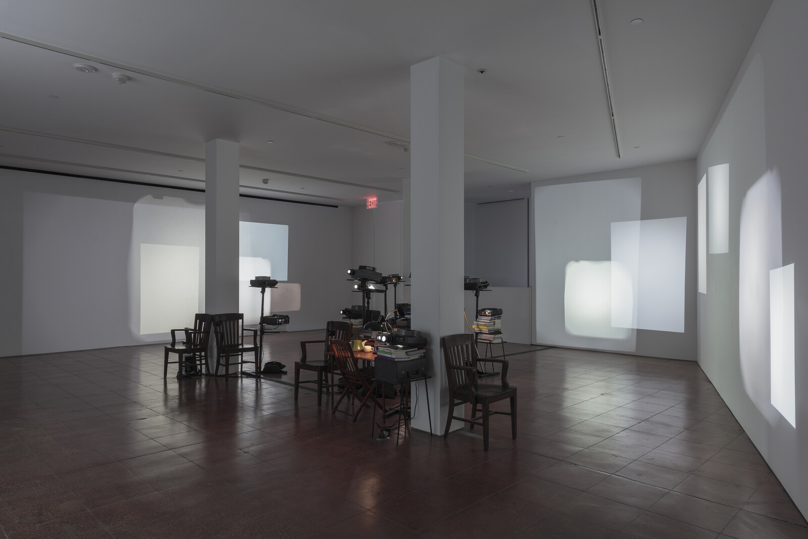 A series of slide projectors are supported by stacks of books and pieces of wooden furniture. The space is darkened, only illuminated by streams of light exuding from the projectors, as well as the images they produce: a range of abstract squares and rectangles in various shades of white that linger on the walls in a quiet rhythm. From a handful of speakers spread across the room, a recording is transmitted, with the sound of the artist’s voice, speaking English with a subtle German accent.