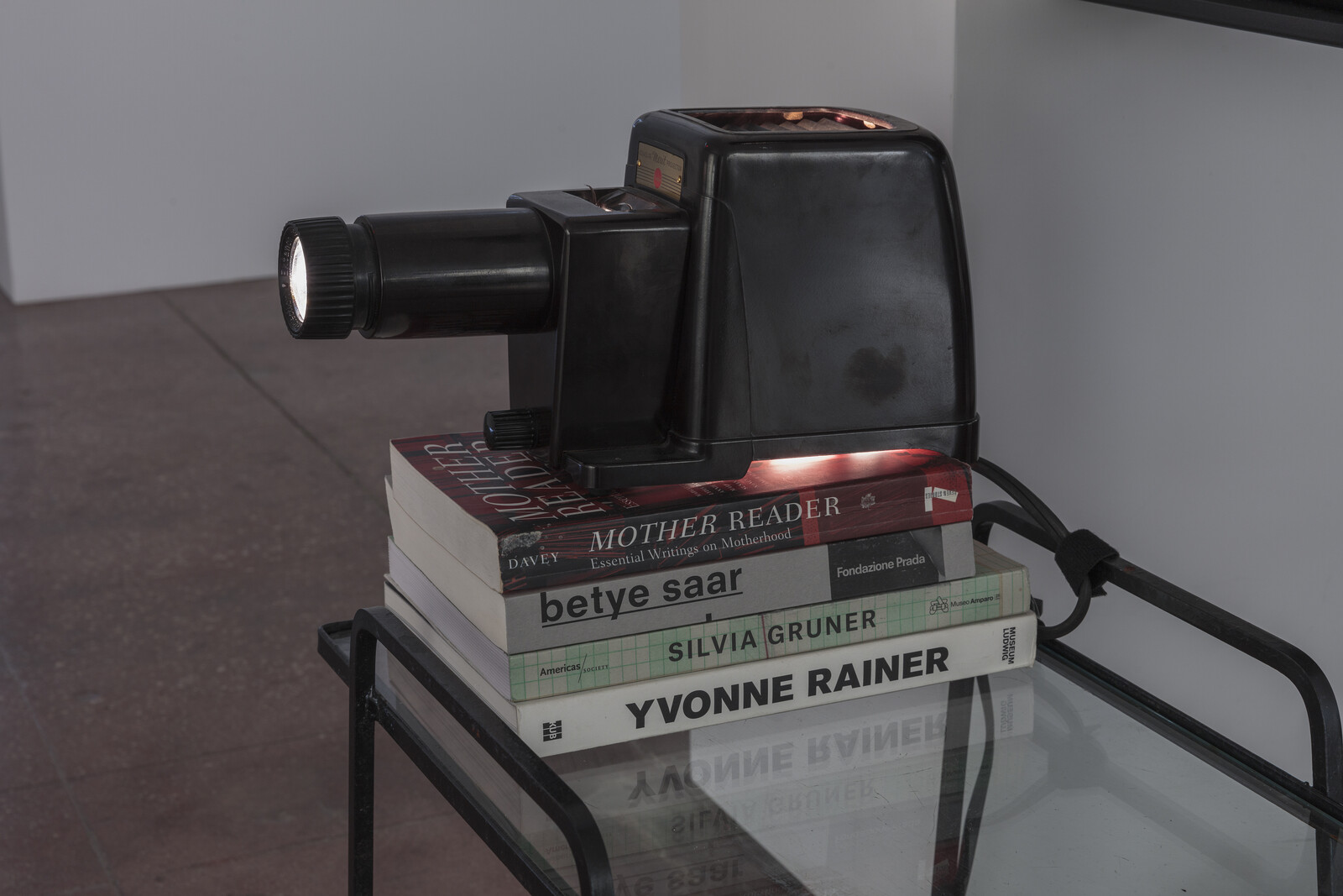 Akerman’s rigorous commitment to frontal images, preferring structure over narrative, won her the label of a “minimalist” filmmaker, an association she did not necessarily approve of. Yet it is exactly these frontal images that are evoked by the slide projections, screens that show nothing but their own structure. Listening to Geyer’s reading while watching these flickering projections, the shapes gradually start to feel like apparitions, providing the ghostliness referenced in the work’s title. Who is this ghost? Surely, it must be Akerman, who haunts Geyer’s practice? Or could it be Akerman’s mother haunting the filmmaker, who committed suicide one year after her mother passed away? Or, is the ghost more abstract, evoking Jacques Derrida’s concept of hauntology, which proposes that the present is always haunted by the future and the past?