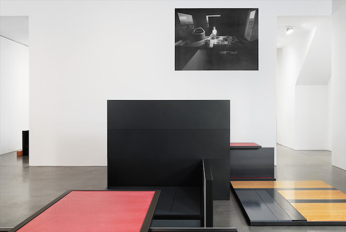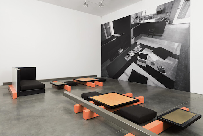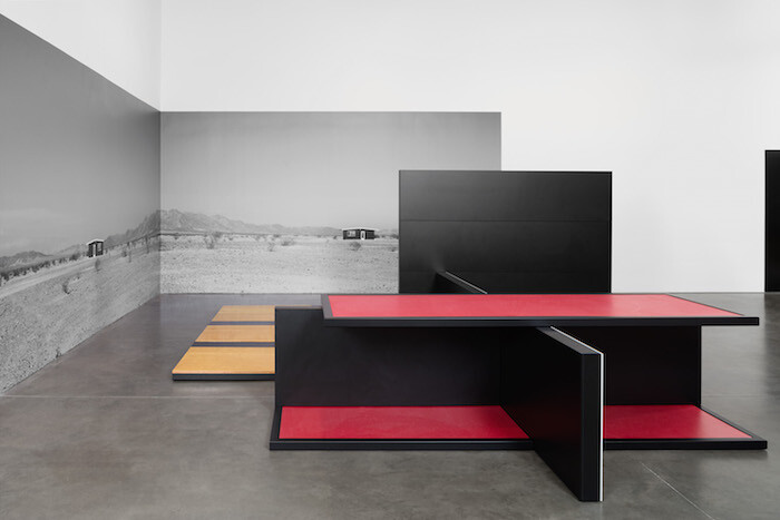 In the back gallery at Andrea Rosen, a wall-sized photograph shows a Planar Configuration in situ back in the Mojave, again connecting the exhibition’s two venues. Also installed in this room and at Zittel’s residence near Joshua Tree is a pair of Linear Sequences, which include a padded seat and two small cushions around a small, low table. It’s hard to envision these as sites for socializing or even extended relaxing. Humans don’t organize the space; space is meant to organize the human, which is another way of acknowledging the power of the desert landscape directly outside. Zittel makes sites within sites, which is a form of theater. The Planar Configurations and Linear Sequences in ways feel like stage sets, and the three photos of their installation are a documentation of their performance. This is social sculpture for domestic abodes situated in a harsh environment. That’s a metaphor, a psychological symptom, and totally real.