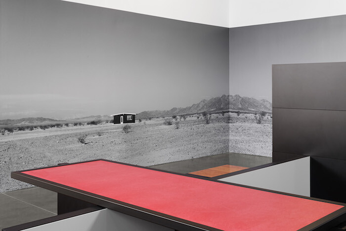 An enormous panoramic black-and-white photograph featuring a renovated pair of those Mojave Desert shacks wraps around two walls at Zittel’s current Andrea Rosen show. Although they might look inhospitable, Zittel has produced matching interior settings for them that are on display in the gallery. These two Planar Configurations (all works 2016) could be Constructivist sculptures, but in fact are a large table, a room divider, a bed frame, and a detached wooden floor meant to create a living space in which to cook, sleep, and recreate (which would appear to involve reading and working on a laptop computer). That these two units go in the photographed shacks isn’t obvious at first, but another large photograph high on the gallery wall shows a version of this modular interior installed in one of them.