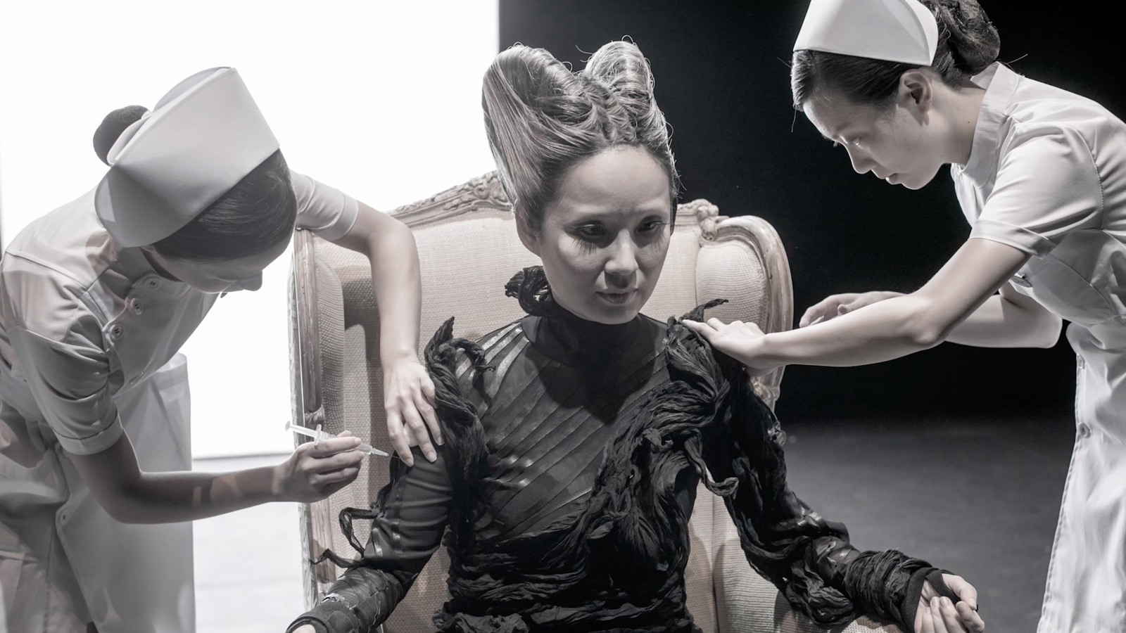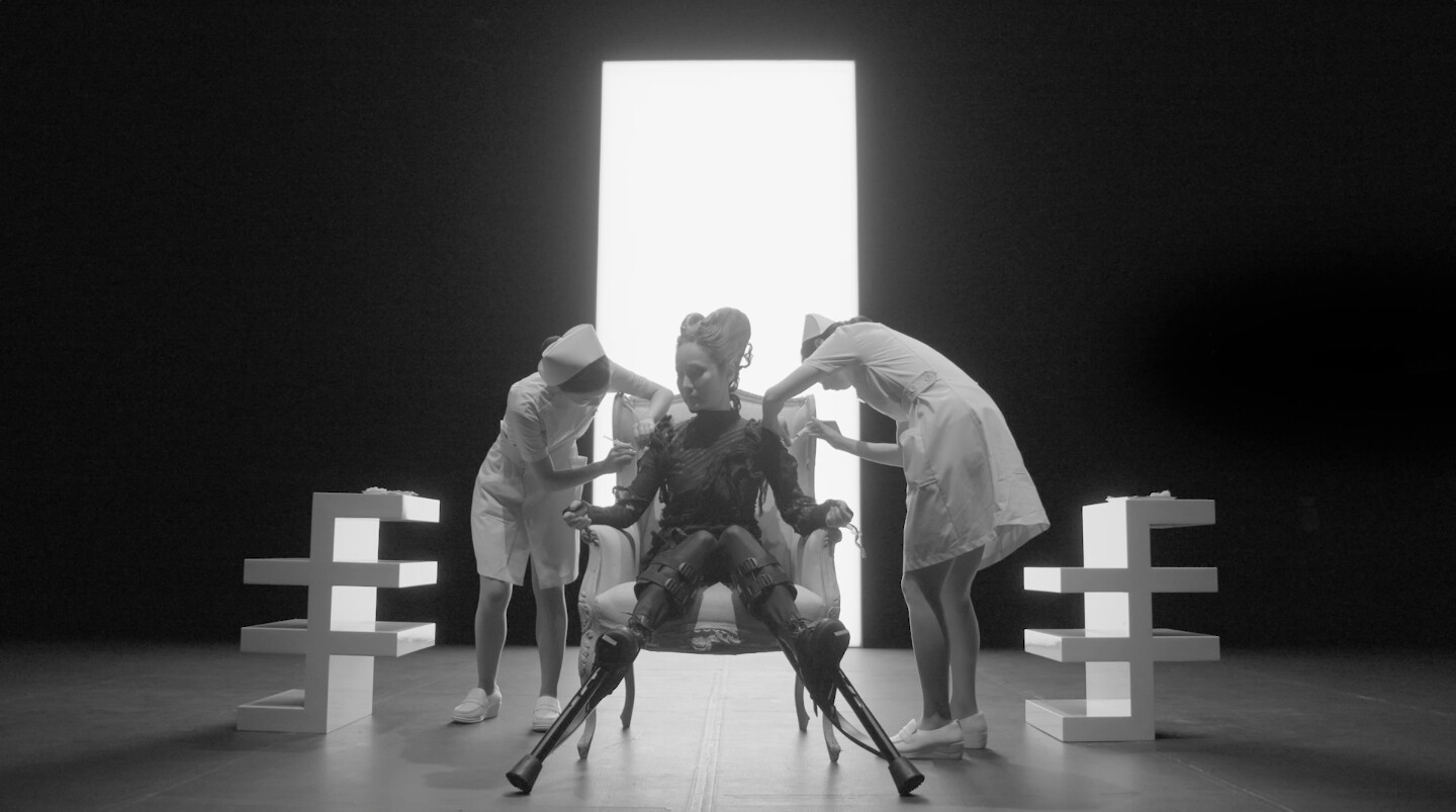 This fact, the near-immutability of outbreak narratives and the artist’s frustration at her inability to significantly transform them, forces Su to take matters into her own hands. In the last two-and-a-half minutes of this thirteen-minute video, as John Zorn’s Metamorfosi (1985) blasts in the background, things take a drastic aesthetic turn into goth-glam territory. Su, wearing prosthetics and heavy make-up, appears for the first time in person and enters a setting reminiscent of the monochromatic pop-madness of Lady Gaga’s video for Bad Romance (2009). She walks on all fours with the help of stilts, wearing tattered all-black, her hair in a marine-creature-like coiffure previously seen in Alexander McQueen’s spring 2010 runway show, Plato’s Atlantis.