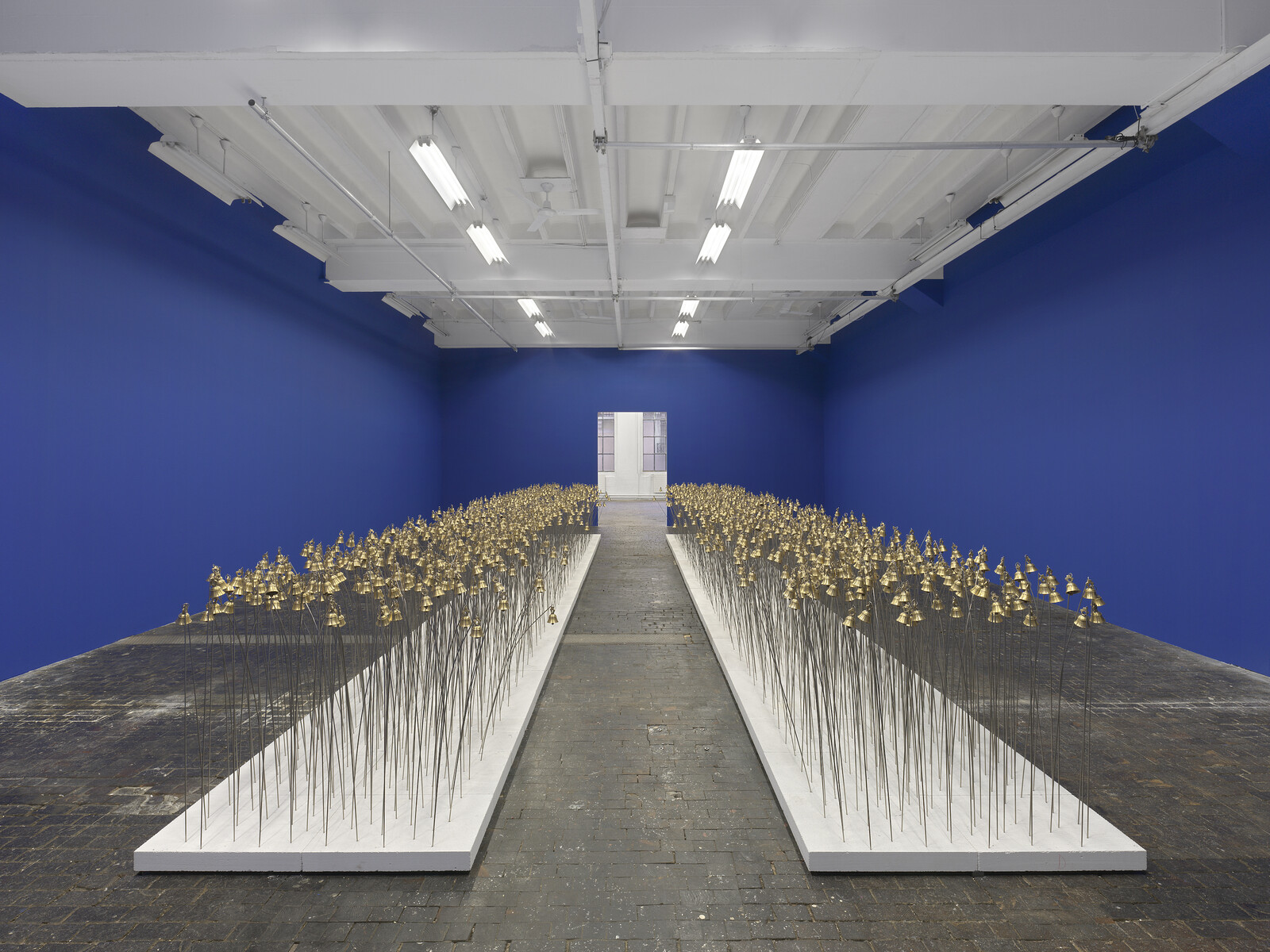 Réquiem is one in a series of remarkable pieces anchoring Obá’s “Rituals of Care,” his first solo museum show in Europe, curated by Andrea Bellini and sprawled across two floors of the Centre d’Art Contemporain in Geneva. Visitors enter the exhibition through a field of tiny brass bells, each hooked onto a metal stake that has been plunged into of one of two white concrete blocks on either side of a suggested path. With this iteration of the installation Jardim (2022), Obá entices you to tread that path, at varying speeds, while running your fingers through the bells. The result is an unholy racket that is both thrilling and cathartic, given Obá’s demonstrated commitment to transubstantiating some of the more devastating facts of human history—colonialism, the transatlantic slave trade, religious warfare, and the persistence of twenty-first-century racism—into strange and hauntingly beautiful artworks.