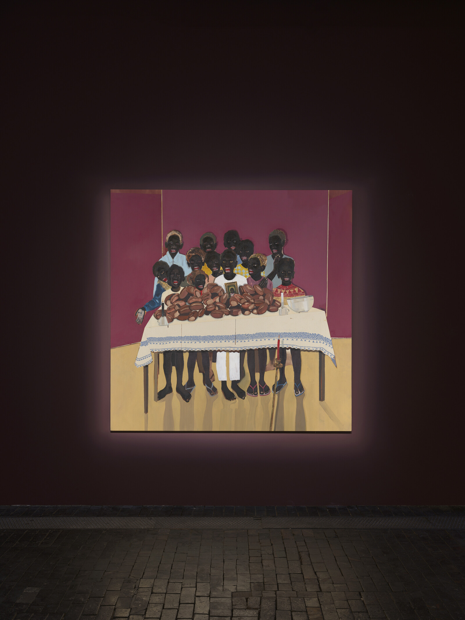 That same year, the artist Antonio Obá painted a harrowing group portrait of thirteen small boys crowded together behind a table piled high with loaves of bread. The central figure, dressed in white, clutches a framed portrait of a haloed head. It could be Saint Anthony of Carthage (Santo Antonio de Categeró), Obá’s namesake and a patron of the poor, who appears often in the rich, syncretic iconography that is characteristic of the artist’s work. But more likely, it is Ágatha. Metaphorically speaking, the thirteen boys are her brothers. The painting, titled Réquiem (2019), is Obá’s act of honoring her life while at the same time raging against her death, and then slipping in the suggestion that society at large has betrayed this Last-Supper-like grouping of pre-adolescent boys. Deep-red walls, flatly painted and creased in gold, seem to be folding in around them. A tablecloth with dainty blue patterns hangs over but does not hide their tender feet. Each boy’s face is half-filled with vampire teeth, shockingly white, dramatically filed to sharp points, and set against blood-red gums. Their expressions convey a heavy inheritance made all the more burdensome by the lived experience of hunger, fury, and defiance.