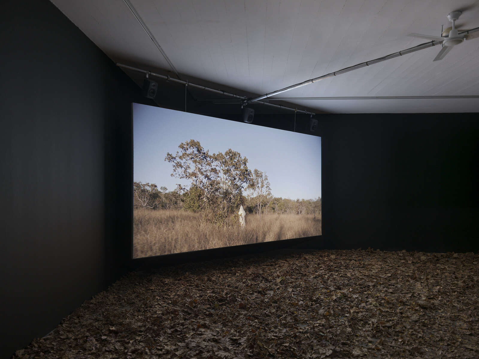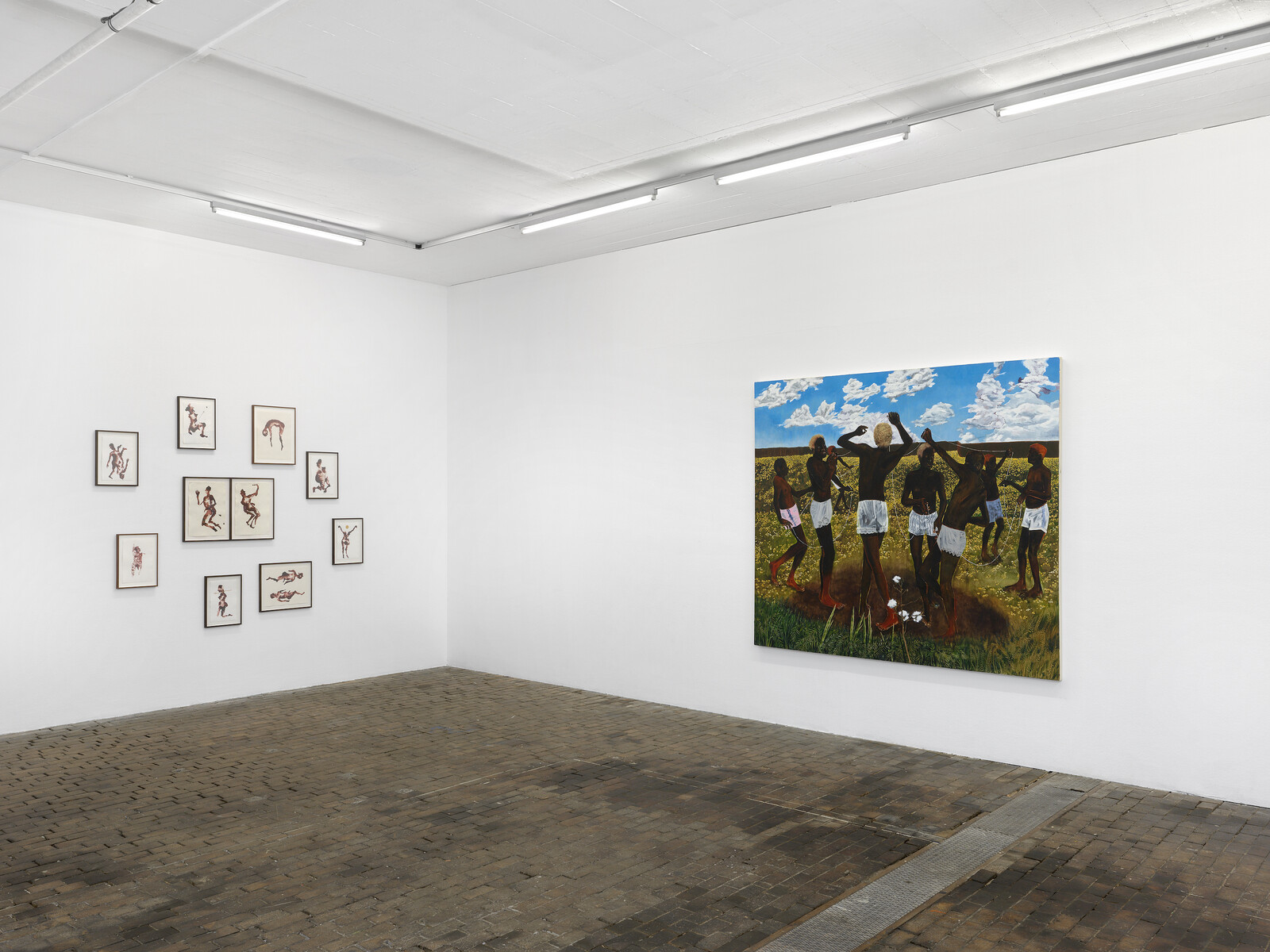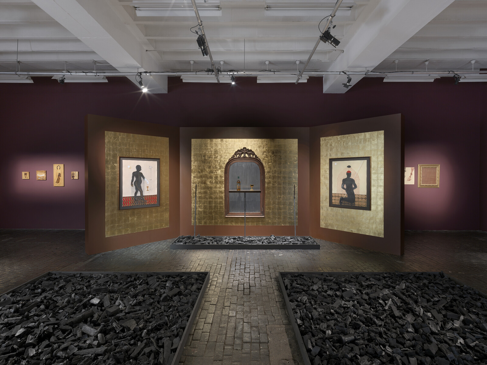 Those traditions course throughout the current exhibition, which includes more than two dozen paintings, three large-scale installations, a few sculptures, and a roomful of drawings made directly on the walls. Some of the installations are over the top. Among them is Malungo - rito para uma missa preta (2016), featuring an altar on a wooden plank, bottles of cachaça, an abundance of gold leaf, and three low troughs filled with bits of charcoal and ex-votos in the shape of saints, orishas, and other spiritual figures. Others are less maximalist and more promising. In Encantado (2024), documentation of a performance—showing the artist lurching through a forest as he struggles to free himself from a rope-like tunic—is projected onto a huge screen, alone in a room scattered with crunching leaves and the smell of earth. The bronze sculpture Obra em negro (Work in black), from 2022, with a dozen shapes strung from the ceiling and vaguely reminiscent of spiked seedpods, provides further evidence of Obá’s strength as a formalist.