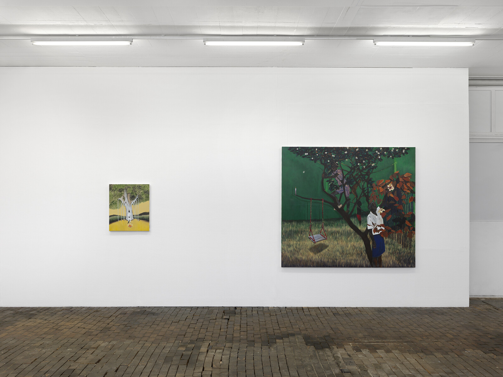 The paintings, meanwhile, move purposefully through portraiture, landscape, historical drama, a glimpse of modernist décor (in Trampolim - banhista, 2019), and the three graces as allegories of life, death, and courage. The orisha known as the trickster Eshu stands in the center of Obá’s magisterial Stranger Fruits - genealogia (2020), a painting named for (and to my eye as powerful as) Billie Holiday’s version of “Strange Fruit,” a pain-filled, disturbingly alluring song about lynching, which Angela Davis memorably described as having “put the elements of protest and resistance back at the center of contemporary black musical culture.”3 Marked by his vivid red shorts, Eshu lingers in a field behind a resplendent flowering tree. A swing hangs from one of the branches, alongside a lit candle. Two figures—a boy and an older woman standing in for Obá’s grandmother—have lodged themselves among other branches. It appears to be night, the sky a garish green, except that the tree and swing are casting strange shadows, turning the painting inside out such that sky becomes wall, the field of wheat a stage set.