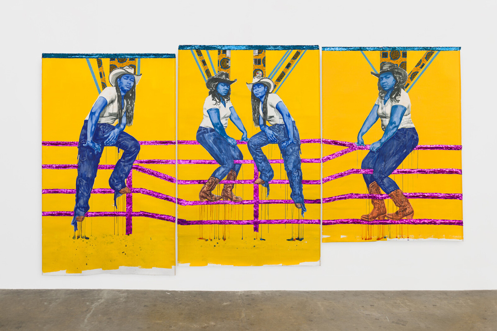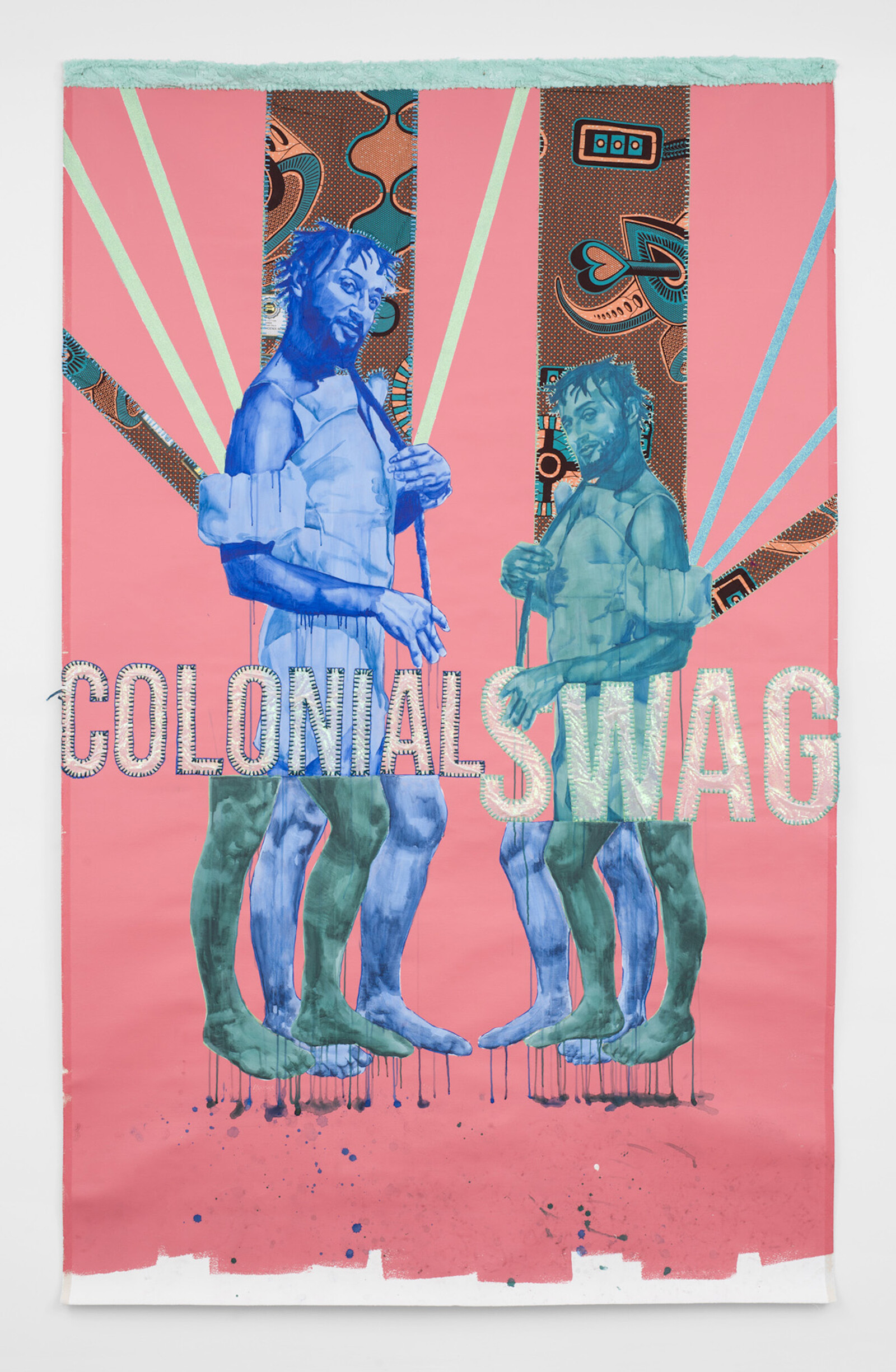 This Old West topography emerges in And My Flames Stay Till You Get Out My Way, a three-panel painting displaying Britt Brat and Pinky from the Maryland-based, all-Black rodeo team Cowgirls of Color. Dressed alike, these twinned figures perch on a magenta sequined fence that pops against a sundrenched, yellow backdrop. The adjacent tapestry, DUNE, represents arid climes which directly reference the planet Arrakis in Frank Herbert’s 1965 novel, as well as actual desertscapes in Namibia. A figure of the bikini-clad actor Astra Marie Varnado occupies the center of the tapestry, while the cropped likeness of fellow fat liberation activist JerVae dots either side. This mirroring motif recurs in Enjoyment, a large, curtain-raiser painting that features Ghanaian-Romanian musician Wanlov the Kubolor. Outfitted in a baby doll dress, the musician’s coquettish poise evokes a queer approach to sovereignty: two smiling watercolor figures stand facing one another, their appendages doubled and dripping. Hand sewn across their waists (and the width of the tapestry) are the bold words “Colonial Swag.” The art historian Julia Bryan-Wilson has connected certain Black craft practices with “flash,” which she defines as a “register of Black American life [and] style” that pushes “past the perimeters of respectability.”4 Dispensing with drab, colonial ways of worlding, Bey adopts across Atlantica a bright, flashy aesthetic—on par with the syncretic Junkanoo parade and costumes—where hybrid textile techniques such as stitching, textual narrations, and photographic patchwork become tools for cartography and representation.