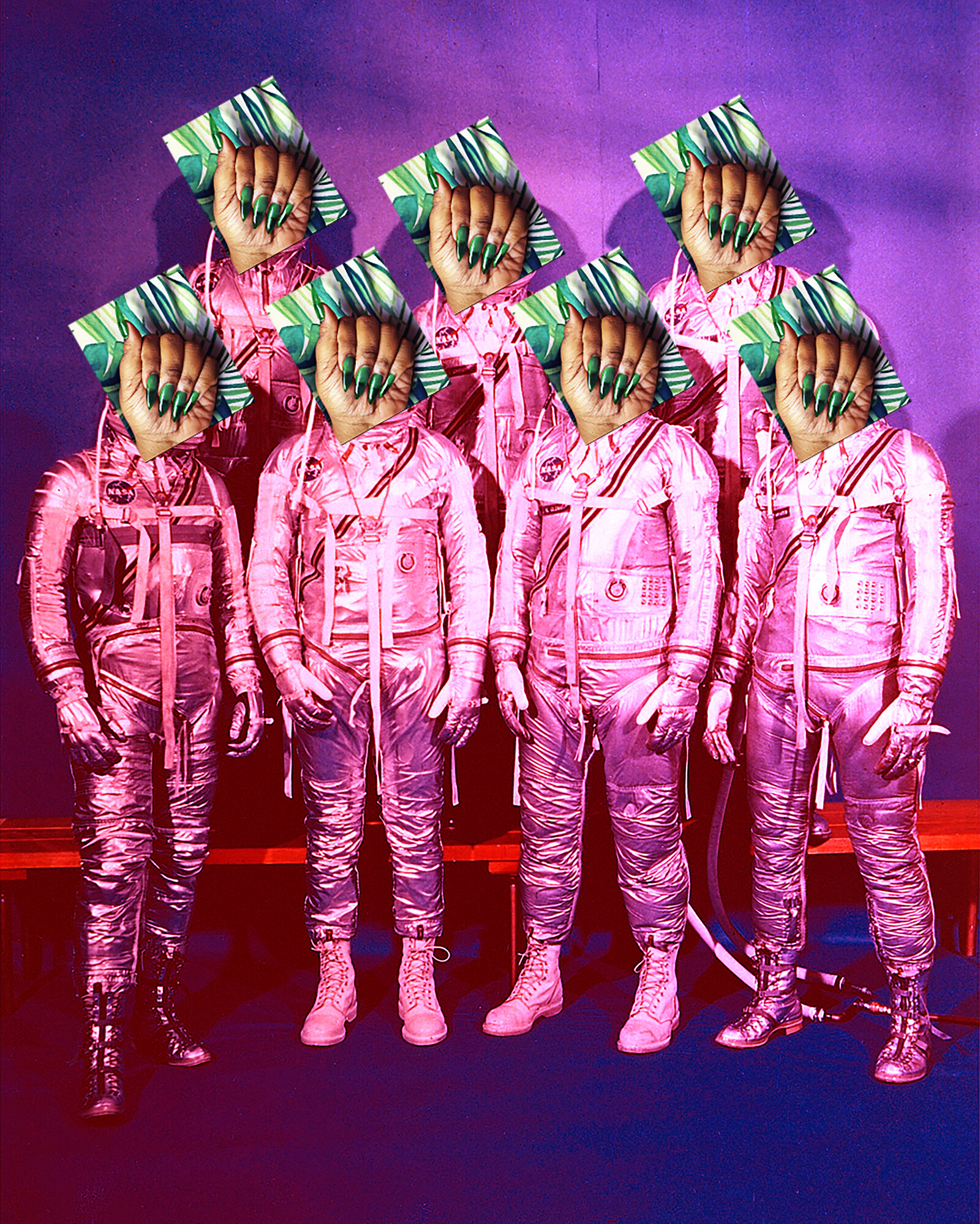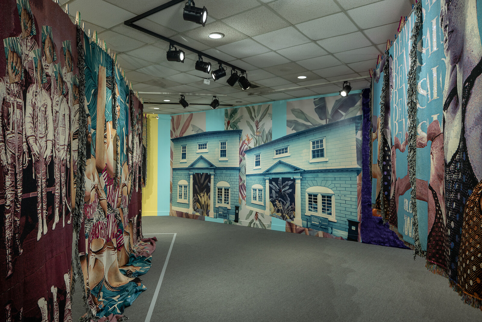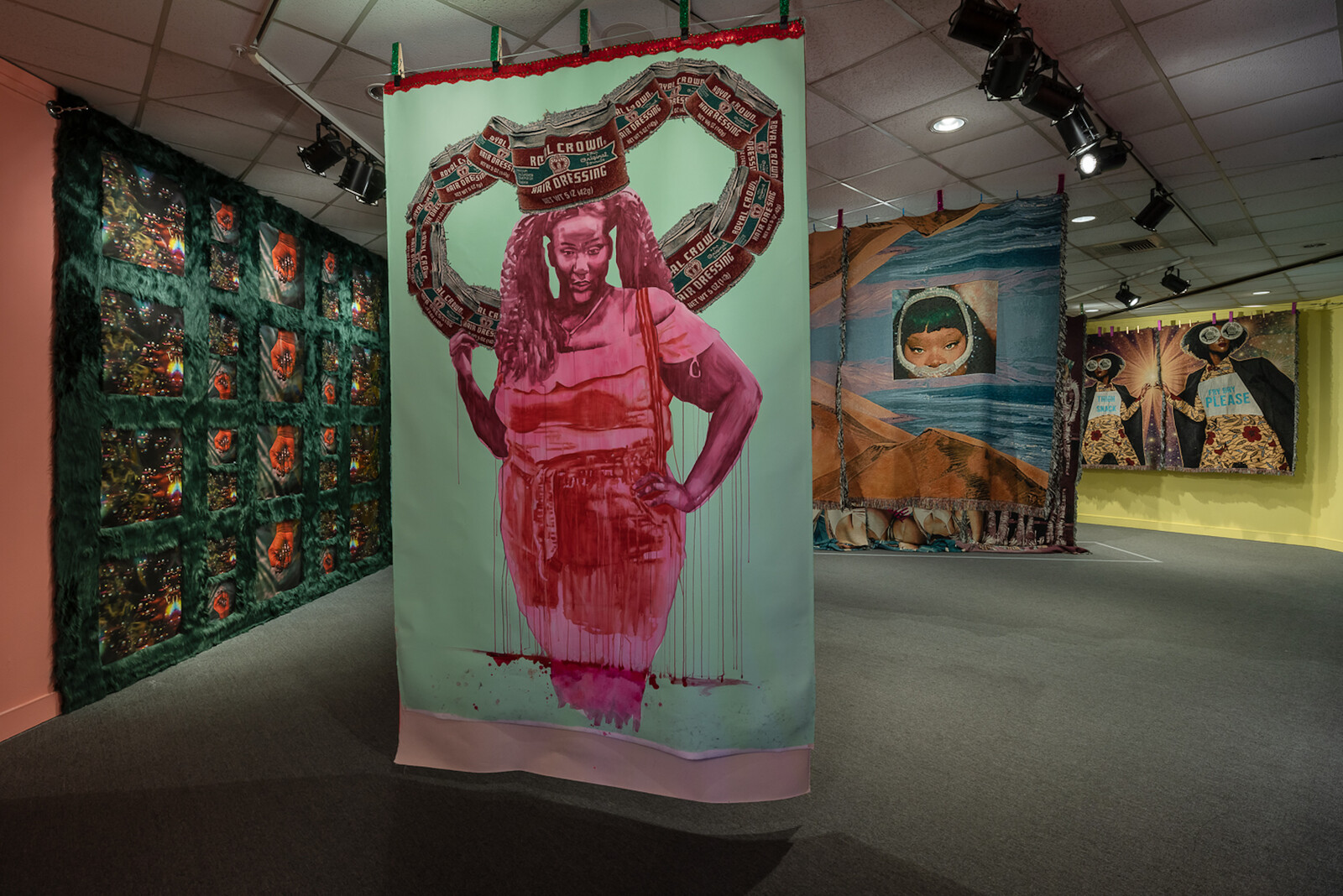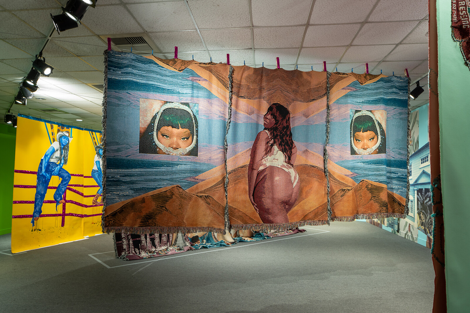 Continuing with a sense of sonic spirituality, the next room, titled “The Gilda Region” after Jewelle Gomez’s 1991 speculative novel The Gilda Stories, displays three wall vinyl pieces; two murals composed of high-gloss photographs and faux fur; and eight large paintings and hanging tapestries that are either hand-sewn, digitally woven, or a blend of the two.2 These works weave a queer neo-slave narrative about the people and places that make up the imaginary planet of Atlantica—a fictive land Bey inherited from tales her father told her as a child—and confront real-world anti-Blackness by venturing into what Gomez describes as “some mythical future as if the wild west existed in the stars.”3