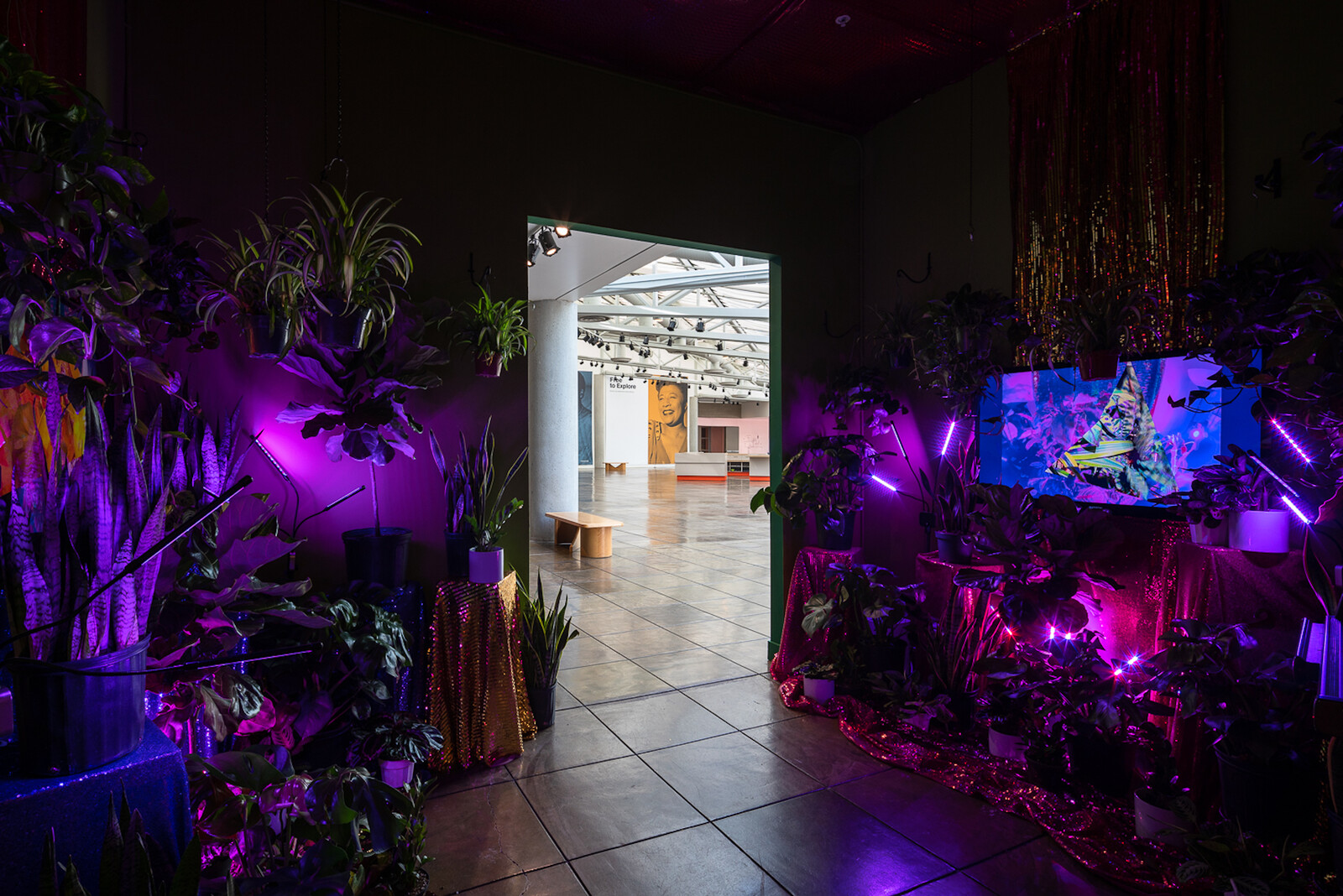 What is the blueprint for Black liberation? And where does Afrofuturism fit into it? As if in response to political philosopher Joy James’s charge that Black liberation lacks a workable model, April Bey’s immersive two-room installation offers ways to reimagine Black futurity and governance against the civilizing agenda of European humanism and the afterlife of colonial dependence.1 At the magenta-lit entrance, dubbed The Portal Room, I’m greeted by an effervescent ecology of live plants. On opposing walls, framing the room like clasped hands, are two time-lapse videos—Julia and Namibia (all works 2021)—showing calatheas (also known as prayer-plants) bowing and bending to the revolutionary sounds of Super Mama Djombo. The Guinea-Bissau funk band’s name venerates Mama Djombo, an initiation spirit who presides over an uncleared sacred forest in Cobiana. That Mama Djombo grew in popularity during the anti-colonial struggle in Guinea-Bissau underscores an idea that varied acts of spirituality—from song to ecological conservation—are central to emancipated Black futures.