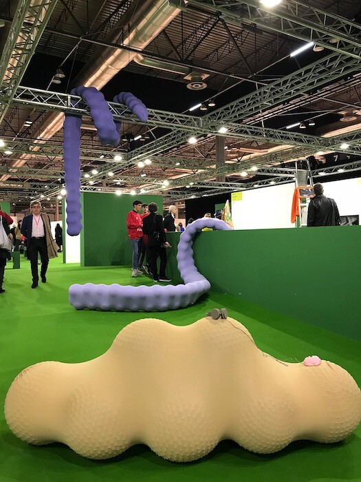 This year’s edition of ARCOmadrid embraced a temporal and conceptual gambit: the Future. It was, however, mostly corralled in the eponymous section at the fair, curated by Chus Martínez, Rosa Lleó, and Elise Lammer and featuring works by artists from 20 international galleries, including Nara Roesler, São Paulo; Union Pacific, London; Crèvecoeur, Paris; and A Gentil Carioca, Rio de Janeiro. The works were all installed in a booth-less platform, which made the viewing experience more akin to a group show than a traditional art fair. The elevated area, designed by architect and Manifesta 12 co-curator Andrés Jaque was carpeted with a bright green fabric—theater stage meets mini-golf course—which flattered the playful solo presentations. Eva Fàbregas’s installation for London’s Tenderpixel was generating plenty of attention on preview day. Featuring drawings, sound pieces, and large-scale inflatable sculptures sprawled on the floor and hanging from poles like giant millipedes, Picture Yourself as a Block of Melting Butter (2017) explored the dissolution of the body-object frontier through the lens of somatic experimentation, ASMR techniques, and the commodification of wellness.
