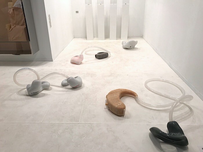 And indeed, as the battle between a fresher, freer future and a rancid, repressive past was playing out (conceptually, at least), across the aisles at the fair it was business as usual. The mood on the floor was dynamic on preview, with sales and inquiries happening quickly from the early hours. In the General section, returning blue-chip galleries like Thaddaeus Ropac and Hauser & Wirth were reporting early sales, their booths packed with people. Berlin’s König Galerie made its ARCO debut with a phenomenal booth showcasing works by Alicja Kwade, Camille Henrot, and Monica Bonvicini, among others. A series of hearing aid sculptures by Amalia Pica, titled “In Praise of Listening” (2017), stood out particularly. Lying on the floor, blown up out of scale, Pica has elevated these small plastic prostheses, which tend to remain hidden in everyday life, into enchanting objects in marble and granite, dignifying their almost miraculous function and organic forms.