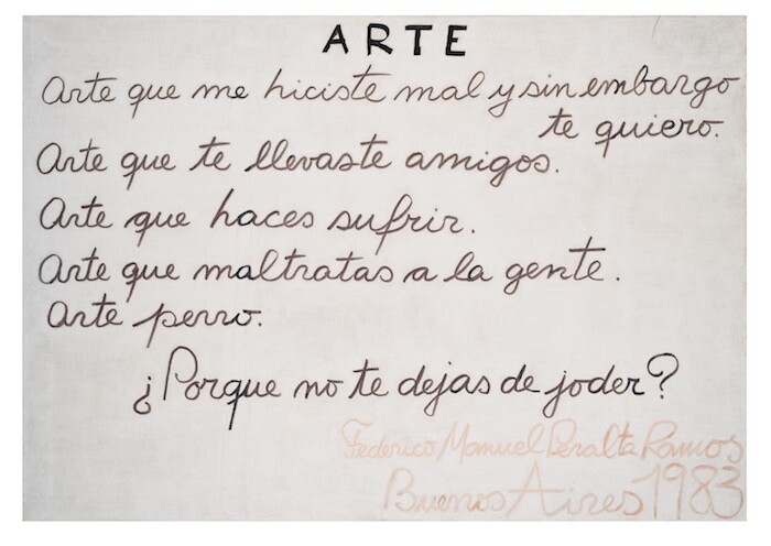 But perhaps the best discovery in a genuinely rewarding edition of the fair came courtesy of the Buenos Aires gallery Del Infinito, which showcased a stunning, uplifting solo presentation by Federico Manuel Peralta Ramos, introducing him to the Spanish and international markets. The late artist, a little-known but highly influential figure in the Argentinian avant-garde, combined Dadaist irreverence with a conceptual stance. His paintings, installations, and performances, created through the 1960s, ’70s, and ’80s, made him a cult figure in the Argentinian art scene. Del Infinito is one of the agents that is now working hard to insert Peralta Ramos into global art history—a worthy effort judging by the artist’s emotive yet hilarious works, combining a personal search for meaning (in art, as in life) with an inchoate drive toward institutional critique. As I looked at his 1983 piece ARTE—a small white canvas with a handwritten message that reads: “Art, you did me wrong but somehow I still love you; art, you took some of my friends; art, you make people suffer; dog’s art; why don’t you stop fucking me up?”—it felt like the perfect kind of work for our present times.