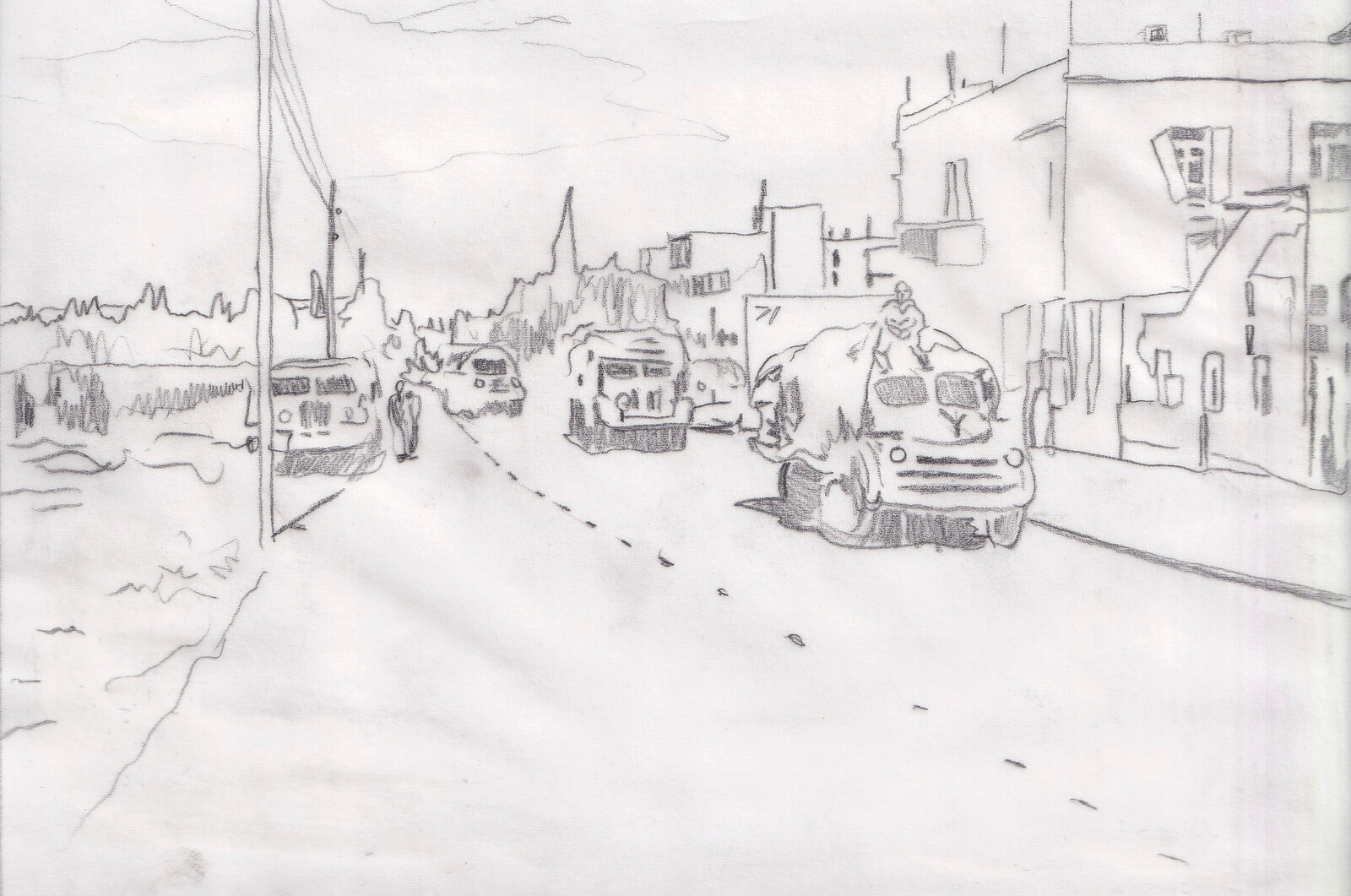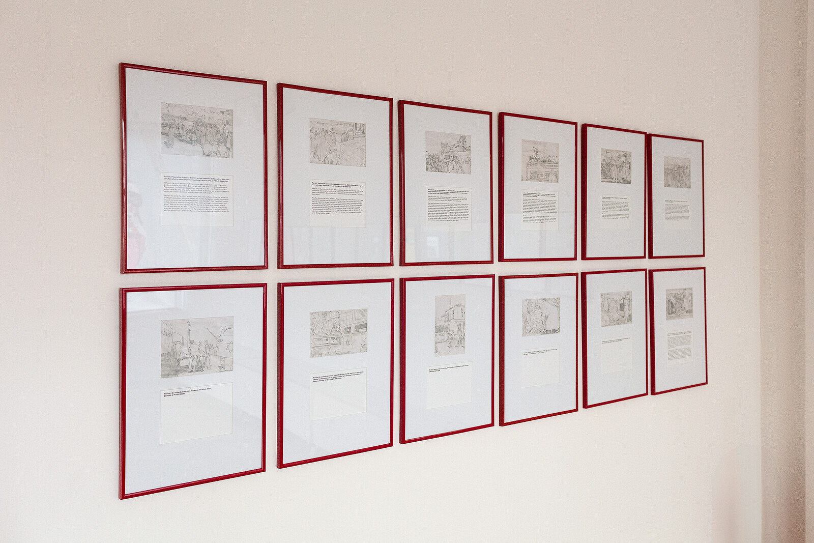 Azoulay selected 25 photographs from the 600 she had been shown, and made pencil drawings of them (reproduced here as prints to “acknowledge their photographic nature”). They appear to have been lightly traced, the outlines of people, suitcases, and carts clear but not firmly insistent, the shading sometimes more so, events thrown into stark relief under an unforgiving sun. Below these “unshowable photographs,” and held also in window mounts, she added her own rather more interrogative captions, which ask questions of what is shown and not shown, and which the “truth” of the archive omit wholly.