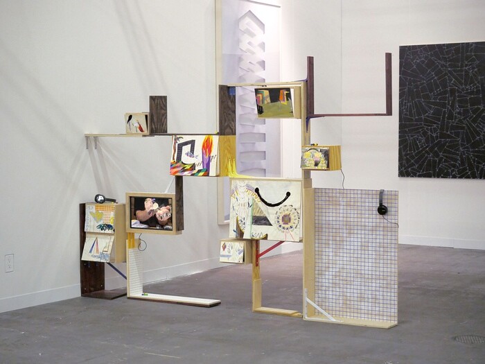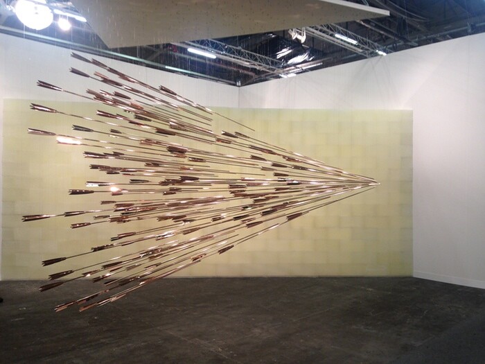 Trendspotting is a competitive sport at art fairs. Still, with every fashion, there’s always an artist who either reinvents worn forms or executes them so well it’s hard not to admire. This year, it’s the case of objects hanging from fishing lines—a frequent fair staple—and Glenn Kaino’s A Shout Within a Storm (2014) on view at Los Angeles’s Honor Fraser is the perfect example. The 149 copper-plated steel arrows, shining in the strong exhibition lighting, filled the booth, especially since Kaino’s paraffin brick wall, The Last Sight of Icarus (2014), was positioned diagonally against the back corner, pressing the space even further. They’re not site-specific, but seeing them together at a fair—where they seem monumental and ambitious in comparison to all the paintings hanging on drywall—becomes not only impressive, but also meaningful. When sameness abounds, it’s key to focus on the work that’s different.