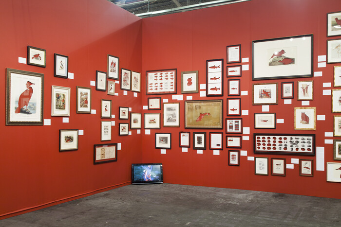At Philipp von Rosen Galerie, Cologne, Anna K.E. showed Post-Hunger Generation (2015), comprising drawings on paper installed in a wooden structure. The architectural configuration served to frame the drawings and a small monitor, showing a man’s hands as he unwraps plastic packages and rearranges their contents (headphones, an SD card, a USB cable) on a table, to the sound of a violin and the crackling of the plastic. It’s a smart piece that—unlike so much work at a fair, which looks polished and ready to sell—delineates process. Which is also the topic of Jorge Méndez Blake’s From an Unfinished Work (The Garden of Eden) (2014), 85 aluminum-made crumpled papers printed with the text from Ernest Hemingway’s posthumous novel The Garden of Eden (trend alert: lots of work about/including literature and pages from books everywhere at both Armory and Independent) at 1301PE from Los Angeles. Ettore Spalletti’s gold-leaf-brimmed panel La luce e il colore, azzuro tenue (2012) also fed off the strong lighting at the fair—so much so that it seemed to float off the temporary walls as light hit the gold. And the simple, even simplistic, gesture of cutting out extinct species from pages of natural history books by Brandon Ballengée in his installation The Frameworks of Absence (2006–ongoing) at Ronald Feldman, New York also gained traction just by being at the fair, exhibited in a booth painted deep red, reminiscent of a nineteenth-century museum.