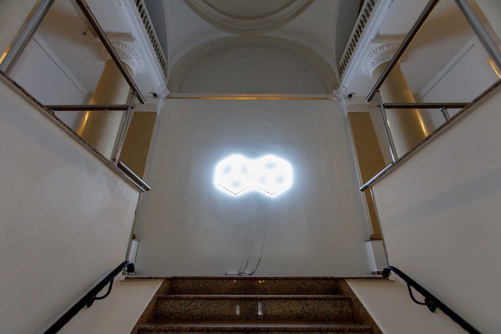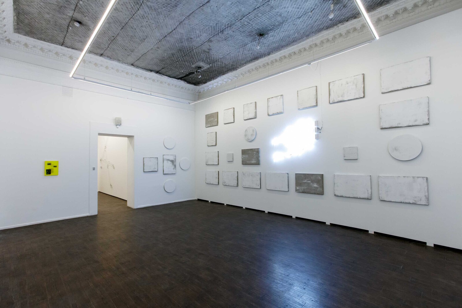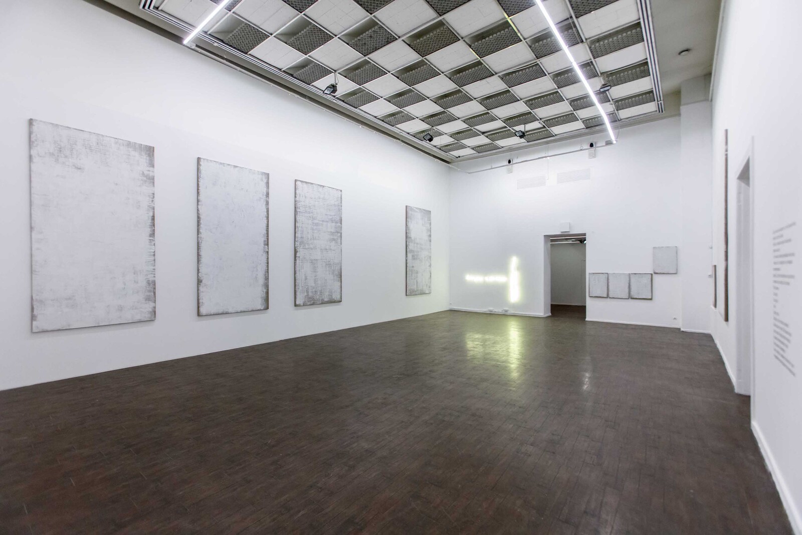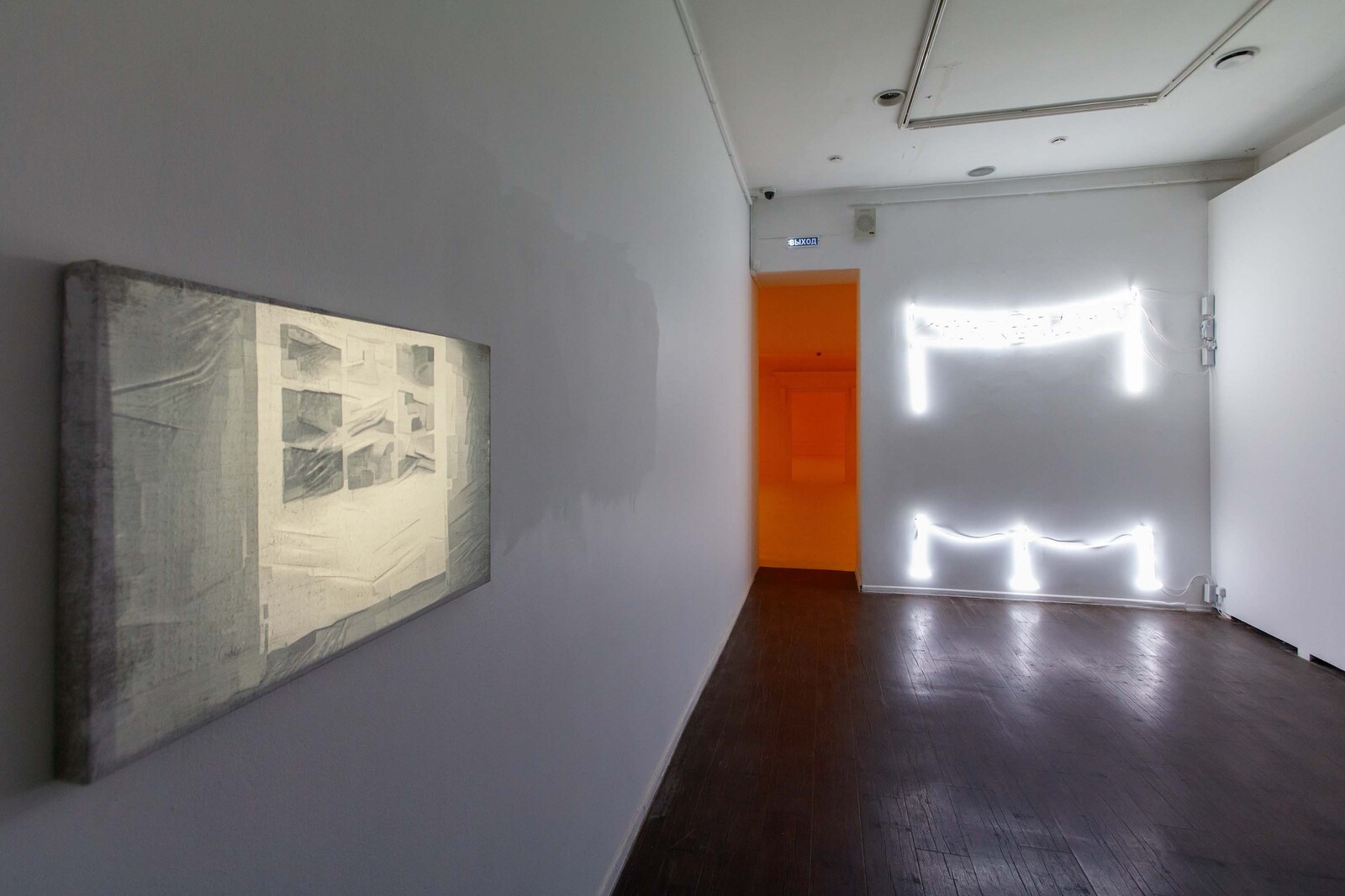 Arseny Zhilyaev’s “The Monotony of the Pattern Recognizer”—an installation of more than a hundred untitled paintings, wall-texts, neon sculptures, collages, and other works arranged according to a series of speculative concepts that comprises his exhibition at Moscow Museum of Modern Art—seems to have been thought out while stoned. “Imagine TENET,” the show seems to propose, “not the Christopher Nolan flick but a freight spaceship lost in some faraway quadrant of the universe, and its AI stumbles upon the Sator Square palindrome from Pompeii, you know, the one reading SATOR AREPO TENET OPERA ROTAS, and starts to unpack it and reconstructs the whole history of European art, from the Romans to the Moderns, in coded images! And… maybe we all are living in a simulation that is created by that AI to get in contact with sentient life and bring us whatever cargo it has on board!”