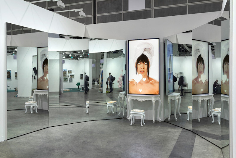 Over at the Discoveries section, London’s Project Native Informant presents Qatari-American Sophia Al-Maria’s video installation Mirror Cookie (2018), starring Bai Ling, a Chinese-American Hollywood actress attacked in her homeland as an “anti-China glamor model.” (A less subtle translation of the epithet would be “porn star.”) Installed above a vanity table and chair in the center of the mirror-lined booth, the video applauds the “bad” girls who have learned to endure a racist, patriarchal reality distorted by media culture. Bai delivers a series of statements direct to camera, from emotional self-help notes (“Know your worth,” “Make it shine”) to enigmatic, spell-like avowals (“You are love more than reality,” “#Magic”). The work is more than a defense of Bai, nor does it promote governmentality, under the guise of “confidence chic,” as remedy for the predicament of women today. Instead, by altering the image and voice of her subject with glitchy visual effects and pitch-shifted vocals, Al-Maria imbues Bai’s monologue with a sense of vengeance. Like a digital sister to Kahraman’s indifferent women, her distorted image defies the violent gaze Bai is subjected to in social media.