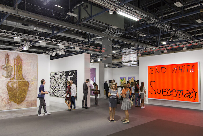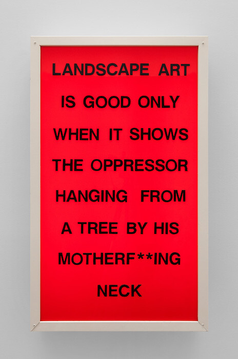 Immediately upon entering the fair, visitors behold Sam Durant’s End White Supremacy (2008) at Blum & Poe, Los Angeles: a huge, red lightbox of a sign, its title scrawled in black. His Landscape Art Sign (Emory Douglas) (2003) is named for the former Minister of Culture for the Black Panther Party and reads: “LANDSCAPE ART IS GOOD ONLY WHEN IT SHOWS THE OPPRESSOR HANGING FROM A TREE BY HIS MOTHERF***ING NECK.” Someone will buy this piece. Someone will buy this piece and that someone may not care at all about black lives or about their own role in white supremacy. They may simply like electric signs.
