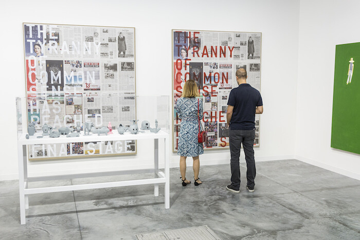 But, at the end of a year rife with videos displaying those oppressors exercising their institutionalized power, it’d be irresponsible to not confront viewers with a harsh reminder, wherever its placement. At New York’s Gavin Brown’s Enterprise, the exasperation about our sociopolitical landscape, expressed with such brevity by Durant, continues. On the day after the election, Rirkrit Tiravanija created three massive linen canvases spread with copies of the November 9 edition of the New York Times: untitled 2016 (the tyranny of common sense has reached its final stage, new york times, November 9, 2016) (2016). The words are painted in acrylic and they are depressing precisely because they are true.