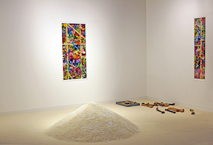 Below, there is a hillock of rice both real and fake, dotted with glimmering fake pearls. Entitled Doppelgängers II (2016), the piece recalls a 2015 scandal in China, in which rice producers bulked up the product with plastic. The impoverished communities eating it fell ill. Such scandals happen stateside, too. One need look no further than the water crisis in Flint, Michigan, the Exide arsenic leaks in Los Angeles, or the impending Dakota Access Pipeline—all of which have affected or will affect marginalized communities. A pile of polyurethane bones beneath the flowers, entitled Support II (2016), feels sinister.
