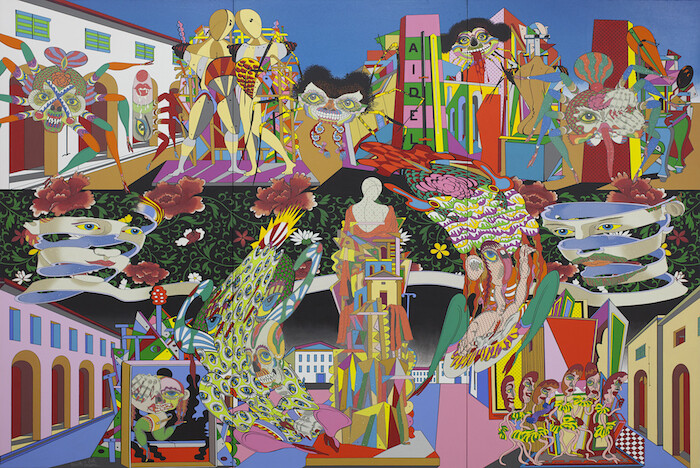 Also of note is Keiichi Tanaami’s 16-foot Dazzling City (2o16) at NANZUKA, the Tokyo-based contemporary art space. Though literally dazzling (it glitters), the triptych is equal parts colorful and grotesque. Bloody-mouthed, demon-faced spiders climb atop kaleidoscopic rainbow buildings; bodies contort and flowers bloom. This, too, examines destruction. Born in Tokyo 1936, Tanaami experienced World War II as a child, and the experience seems frozen in a strangely childlike perspective, in which pain becomes cartoonish and oppression is a literal monster.