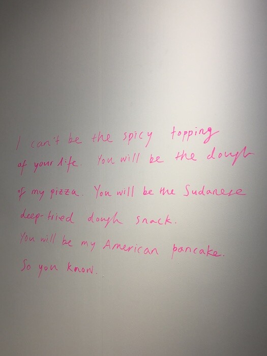 At the fair’s Nova section, where galleries display new work by one or two artists, Seoul gallery One and J. gives Chosil Kil the space to reflect on the multitudinous nature of her identity. The project, entitled I can’t be the spicy topping of your life, so you know (2016), features stuffed humanoid figures, their heads made of plush fish pillows, crawling or screaming or embracing each other on a patch of fake grass beneath an unfairly severed hedge. The fish-creatures are both land- and sea-dwelling; the lawn represents both interior and exterior space. Kil herself moved from Seoul to London; self-perception develops layers when we remove ourselves from that which once defined us. Large pink text on the booth’s wall reads, in a humorous but biting depiction of racial fetishization: “I can’t be the spicy topping of your life. You will be the dough of my pizza. You will be the Sudanese deep-fried dough snack. You will be my American pancake. So you know.”