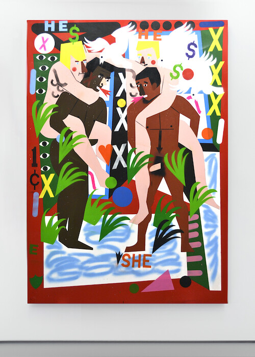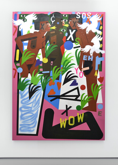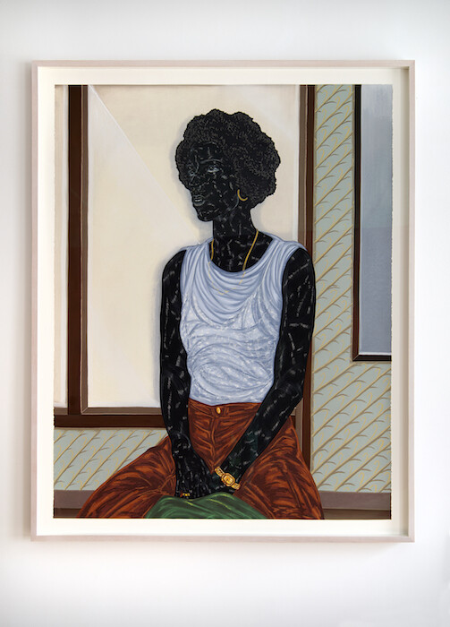 At Jack Shainman Gallery, New York, the subject of Toyin Ojih Odutola’s charcoal-pastel drawing, Six Months Later (2016), asserts and affirms herself, too, though it is less through her words than through her gaze. With Odutola’s signature white-and-gray-flecked brushstrokes, the woman’s skin looks like a galaxy, a cosmos of its own. Her gold jewelry shines, and she looks forward, away from us, and she seems to be cast in the light of a particularly subtle sun. It is enough that she simply exists. The fair also served as the debut of the gallery’s representation of Nina Chanel Abney, whose colorful acrylic-and-spray-paint works are playful, disjointed examinations of sex and race and communication and, perhaps, everything else. In one of her two displayed works, both To Be Titled (2016), light-skinned, blue-eyed men reach for and seemingly wrestle with each other while riding the backs of black men. One’s nose and another’s penis are as white as the men they carry. In the other image, two brown-skinned women and one man simply converse with each other. Their bodies are mostly free and, for now, carry no burden.