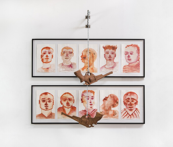 Before I left, I stopped by Galerie Lelong to see their exhibition of Andy Goldsworthy. His piece Hazel stick throws, Banks, Cumbria, 10 July 1980 (1980), a set of photographs depicting the artist throwing bundles of sticks, was soothing, in the way that staring at nature often is. Lelong also had on display Barthélémy Toguo’s Black Lives Always Matter (2015), a series of ten watercolor-and-ink portraits of young black men and boys—some as young as ten—killed by police throughout the United States. A chain dangling two wooden guns hangs in front of the images; the subjects are always, in effect, under threat. Even momentary escapism, I determined, was irresponsible, and I was relieved that even here it was impossible.