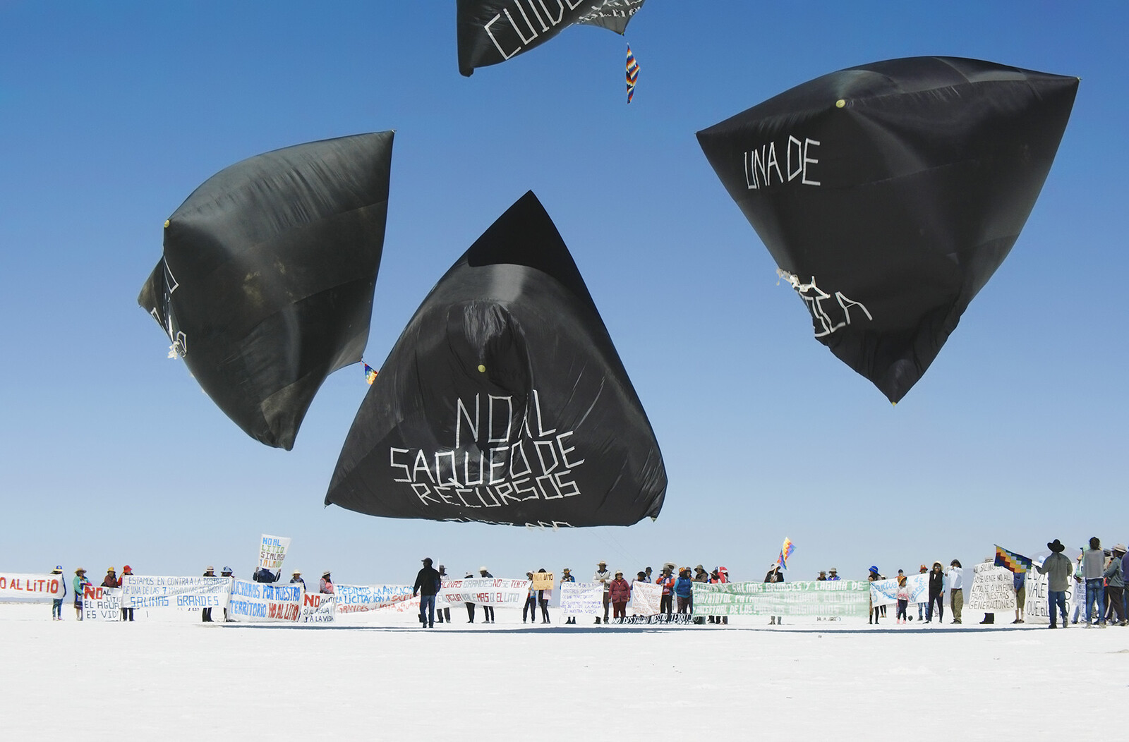 TS: Perhaps I could answer here by talking about the Fly With Aerocene Pacha (2020) project we conducted in Argentina. Last January we were in Salinas Grandes, Jujuy, in the north of Argentina. A place with large salt flats, now (in)famous for its abundance of “white gold,” it is a triangle of land shared by Bolivia, Chile, and northern Argentina, containing one of the biggest reserves of lithium on the planet. Lithium is used in mobile phones and is essential to the energy transition from fossil fuels to the electrification of society. This is done at huge cost to the people who live in this territory: communities who lose their water and their livelihood. For every ton of lithium, two million liters of water are also extracted.