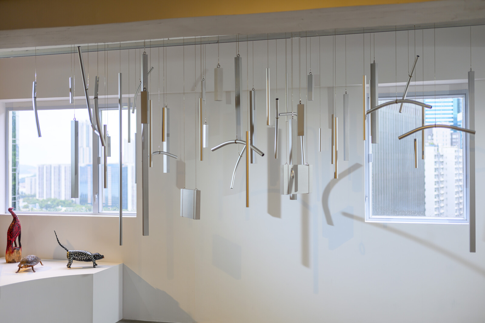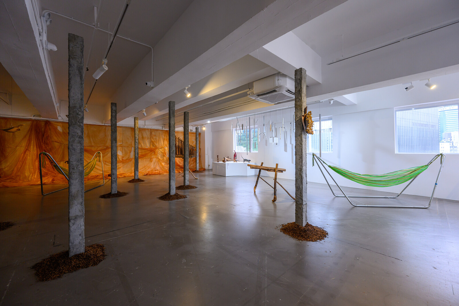 Referring to the cà phê võng providing rest and refreshment to drivers on Vietnam’s provincial highways, this first institutional survey of Art Labor’s activities, curated by Celia Ho, opens with an invitation: to sit (or lie) on a hammock and drink Vietnamese coffee brewed from robusta beans grown in the country’s Central Highlands. The staging of this vernacular rest-stop performs a spatial reconfiguration. No longer are we in Hong Kong, but somewhere in Tây Nguyên, located within the Southeast Asian Massif known as Zomia, its complex textures expressed by a chorus of sculptures, installations, and instruments created by Art Labor—founded in 2012 by artists Thao Nguyen Phan, Truong Cong Tung, and Arlette Quynh-Anh Tran—and collaborators from the Indigenous Jarai community, with whom Art Labor have been working since 2016, alongside invited artists. Among them is musician and artist R Cham Tih, whose standing bamboo instruments in the gallery embody the recuperation of lost Jarai musical traditions through restorative innovation. While K’loong Put (2024) is a traditional xylophone, albeit with additional notes, Klek Klok (2024) is a new design drawing on traditional bamboo gongs used to deter wild birds from the fields.