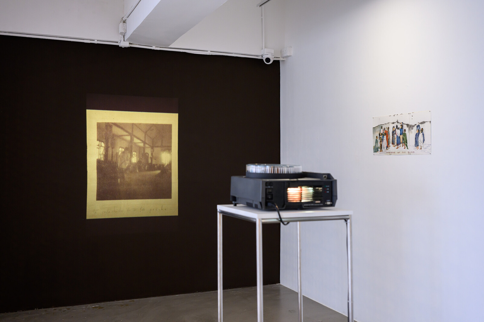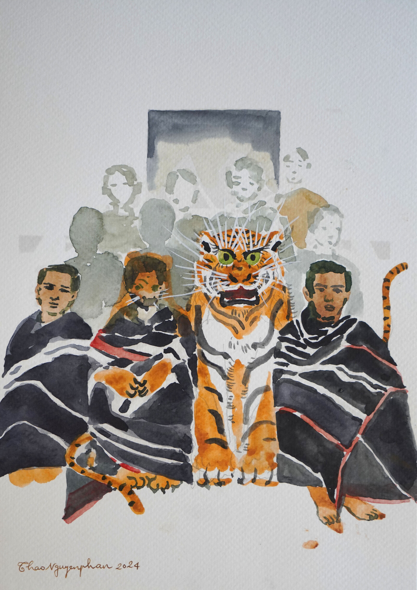 Used to train pepper vines, a series of concrete pillars arranged into a grove in one corner of the gallery highlight the link between past and present exploitations. Often repurposed due to the scarcity of wood, traditional wooden pillars can be seen in archival black-and-white images of village structures that appear in Thao Nguyen Phan’s Foret, femme, folie (after J.D.) (2024–ongoing). The work is presented in a space closed-off by a curtain of wooden beads made from crop trees arranged into a circular pattern, by Truong Cong Tung, aptly titled Long Long Legacies (2021–ongoing). Ostensibly co-authored with European anthropologist Jacques Dournes, Foret, femme, folie comprises a slideshow of photographs taken by Dournes between 1946 and 1970, and Phan’s watercolor responses, including portraits of bare-chested women and near-naked working men, whose discomfiting capture by a European gaze is countered by Phan’s illustrated reflections. Recalling tales that imagined the Central Highlands as a place populated by fearsome animals and spirits, faces transform into tigers or dematerialize altogether as if in a process of fantastic metamorphosis: a projection charged by an intimate curiosity that amplifies Phan’s own position, along with Art Labor’s other members, as a member of Vietnam’s Kinh majority.