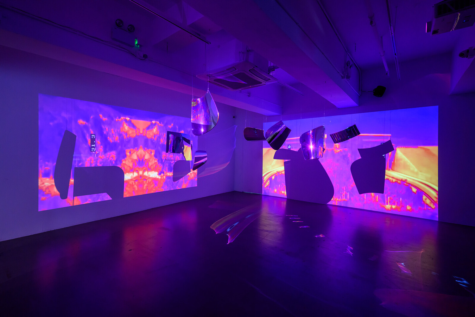 Connections to the present continue in another photo by Dournes showing a man playing the k’ni mouth fiddle. The same instrument is positioned on a table in the gallery laden with wood-carved sculptures by Jarai artists, including a mottled blue water buffalo by Puih Gloh, one of the first to work with the collective, and a chameleon by Puih Han, a young Jarai artist who chose to remain in his village and train as an artisan rather than seek opportunities in the city. Each sculpture seems to respond to Long Long Legacies, where the biological and cultural diversity of an ecosystem, a homeland, has become modernized into a composition of standardized units. Arlette Quynh-Anh Tran’s video installation, The Galaxy of Electrified Heat (2024), speaks to the double-edged sword of this ongoing imposition. Presented on the other side of a wall made from fertilizer bags stained red with soil by Tung (From a land long lost to a land dwindling, 2018), thermal camera footage of the land surrounding a hydroelectric dam in the highlands is projected onto two walls, its pictures reflected and refracted by a hanging mobile of curved mirrors.