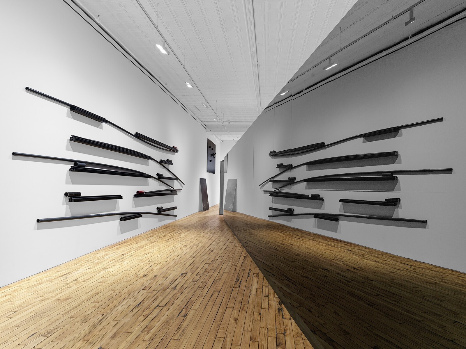 Jafa’s show of sculptures at 52 Walker carries the same themes of Blackness, erasure, violence, and moving images, but in a more damning, paranoid register. A walkthrough structure, studded with extruded aluminum sculptures like bisected window sashes, is wallpapered with blown-up pixelated photos from Jafa’s expansive mood board, pulling the viewer through a hall of horrors. A line of battered white plastic traffic bollards juts out from another wall. But the main event is Large Array II (2024), a personal cultural pantheon ranging from the Sex Pistols to Michel Foucault, rendered as shaped aluminum standees and arranged as if for a class photo. The work cites Cady Noland’s series of aluminum standees from the late eighties and nineties depicting overlapping, clipped-out American icons: the Manson Family, Lee Harvey Oswald. In the front row of Jafa’s group is Noland herself, blocking her face with both hands.