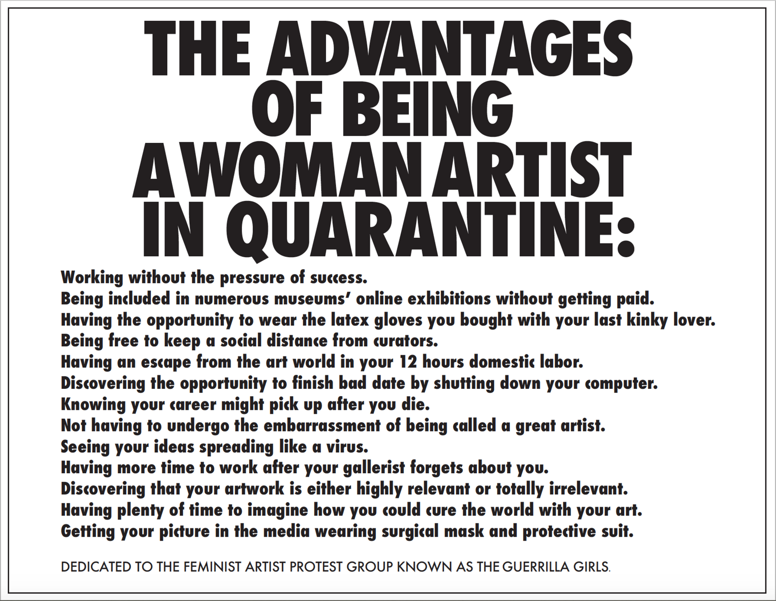 Compared to numerous contributions to the project that feel incidental to the circumstances, if not misplaced, Simnikiwe Buhlungu’s short video My Dear Kite (You Can But You Can’t) – Late Yawnings 01h43 does contemplate what is specific to the current situation. We see a white kite and hear her contemplating the possibility of flying it, despite being stuck in her apartment in the Netherlands (to which the artist has recently moved from Johannesburg). The heavy symbolism is confronted with a more playful emulation of the current uncertainty: “you’re not supposed to be outside, even though you can … but you can’t.” Buhlungu’s monologue captures the way interior feelings echo the sometimes contradictory lockdown measures, political arguments, and scientific debate over sketchy evidence that characterize these times. But it was left to Iveković to take up the gauntlet of creating something that “still has the potential to be subversive,” even if only mildly. Using a font reminiscent of the Guerilla Girls (to whom she dedicates her contribution), a list under the headline “The Advantages of being a Woman Artist in Quarantine” includes “working without the pressures of success,” followed by “being included in numerous museums’ online exhibitions without getting paid.” Touché.