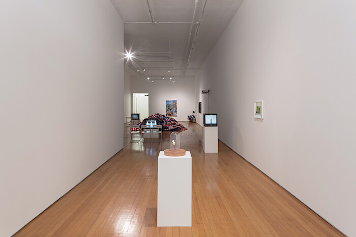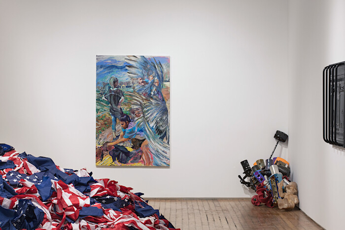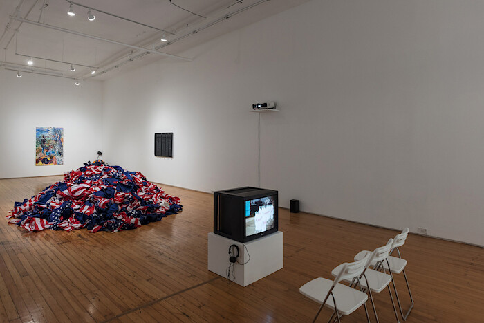 The gallery’s storefront window has been covered with a vinyl print by Martine Syms: a grainy halftone image of a parked white car, which asks, via a speech bubble, “WANT SOME?” Syms’s title replies: Some What? (2016). “Some What?” feels naïve, or parrying—but if the car’s solicitation has the tang of a threat, Syms’s response turns it toward a conversation. Like kids who weren’t yet born in 2001 making 9/11 memes, we haven’t “processed” our trauma very well—or maybe we have processed that trauma exactly, and to render a traumatic image is our best shot at critique. In the middle of the gallery is Flagwaste (Stars and Stripes) (2016) by Gardar Eide Einarsson, a waist-deep pile of red, white, and blue flag scraps that it turns out aren’t destroyed American flags but the trimmings from a flag factory. This, too—mass commodification and its LOLZ-ification—is that for which it stands. Meanwhile Dean’s signal jammer throws a twenty-foot-wide break, and if to “depict” this present moment with a collapsing detachment is all art can manage, at least that might provide for some clarity in the United States’s little nation-picture.