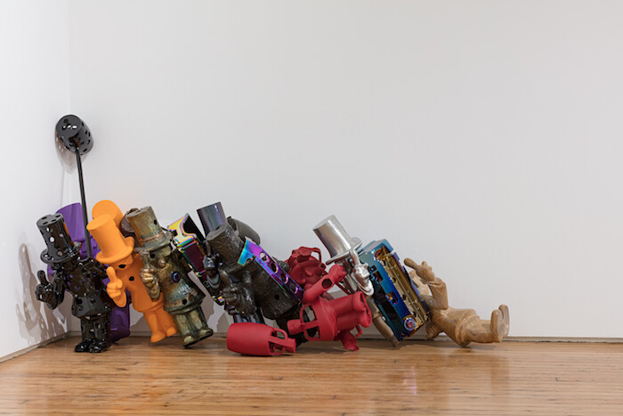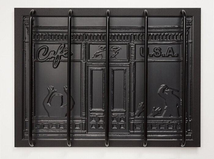 We are on the stage, too, cartoonishly re-performing cartoon violence. For Western Exterminator / Kernel Kleenup / Little Man / Pesterminator (2013–15), by Parker Ito, a dozen statuettes clatter into the gallery’s back corner. Each is a version of the registered trademark of Western Exterminator, an L.A.-based pest control company: a top-hatted capitalist, one hand admonishing a hungry mouse, the other gripping a mallet behind his back. The bronze statuettes are variegated with automotive finishes; some are dismembered, some Swiss-cheesed with holes. In Café L.A. (2015), by Body by Body, the storefront of something called “Café U.S.A.” is depicted in a CNC-routed relief behind a set of powdercoated black bars. In the windows are the silhouettes of a cop with nightstick poised, two sets of hands raised in self-defense. Bunny Rogers’s video, Mandy Piano Solo in Columbine Cafeteria (2016), sets a Mandy Moore-like CGI character behind a piano at the site of an infamous school shooting. (The Columbine cafeteria, of course, is also where security cameras captured chilling footage of the killers.) The girl plays three Elliott Smith tunes, sloshing red wine on the drifting snow, a composite of the late-90s’ early-oughts’ most cliché images of violence, suicide, and teen angst. The piece is a reminder that the United States has been in a saccharine self-immolation for some time.