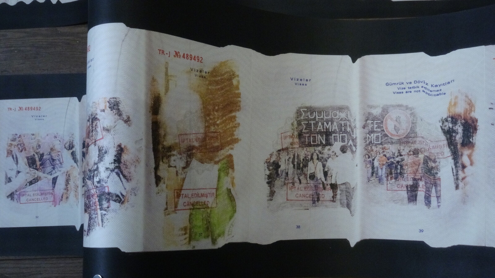 The work invites us to consider the political shifts in both Turkey and Greece since 2006: the Justice and Development Party (AKP) had only recently come to power, Turkey was beginning negotiations towards membership of the EU, and hopes remained that Erdoğan would govern in a democratic manner and bring economic stability. Today, of course, these dreams have failed to come to pass, while Greece has been devastated by an economic collapse which put its own EU membership at risk. Safoğlu’s installation comprises photographs from demonstrations in Athens, as well as images of the Parthenon, the Olympic logo (the games, which took place in 2004, are widely considered to have contributed to the country’s subsequent debt crisis), a police shield, and sleeping activists on the bus. Observing the two long rows of prints, I’m reminded of images on a roll of film. The blurred images, evocative of hazy memory, are juxtaposed with the bureaucratic blue-and-red ink on the passport pages, featuring stamps of all sorts, and the bright visas that require so much effort to get because Turkey is not a member of the EU. There is nothing unreal about a blue passport or a demonstration controlled by the police, but the prints float in the air as if carrying images from a dream.