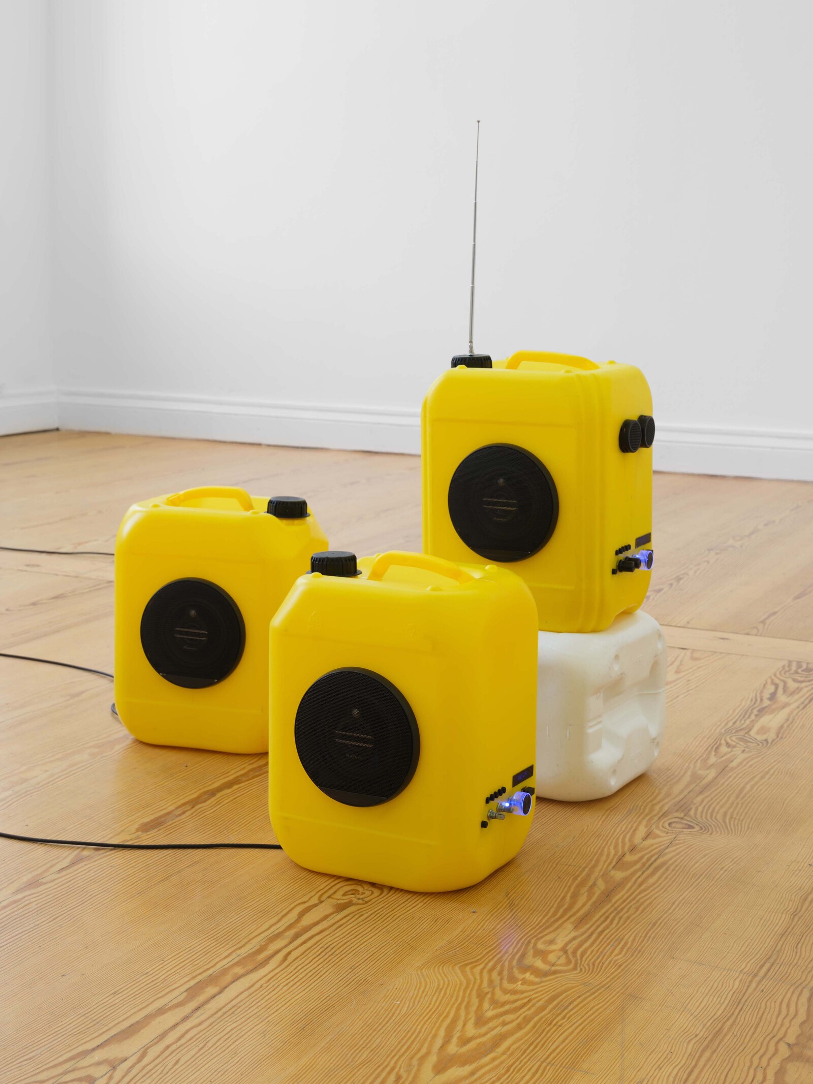 Speakers housed in four modified, bright yellow–plastic jerrycans play soundscapes recorded by the artist over the past decade across Kabul. The title of this sound installation, Bushka Bazi (2023), is the Afghani name for these containers; together with the soundscapes, they conjure a distinct sense of place, but also of context. Introduced to the country through international aid cargos, they have been put to numerous uses since—from water carriers in peri-urban areas suffering from poor infrastructure to petrol-filled explosive devices used by the Taliban.
