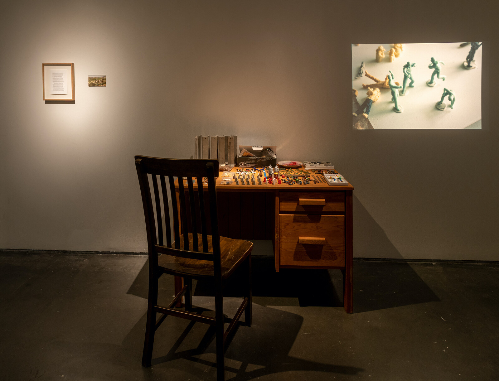 One somber work, a meditation on endless war, home, and the trauma of displacement, is separated from the rest of the exhibition. Memorial To Lost Words (2016) is a mixed-media installation where the room’s only illumination comes from a vitrine that holds replicas of archival letters translated from Punjabi, Hindi, and Urdu to English. Abidi evokes Muharram majlises, with their darkened rooms and melancholic incantations, to memorialize the unheralded soldiers from the Indian army who fought and died in the service of the British Empire during World War One. A sonic backdrop animates the letters: a musical score sung in Punjabi by alternating male and female choruses, created in collaboration with Lahore-based musician Ali Aftab Saeed and London-based poet and archivist Amarjit Chandan.