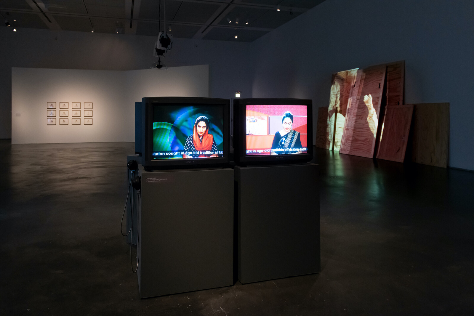 A trio of split-screen videos that Abidi made as a student at the School of the Art Institute of Chicago form the core of the exhibition, clustered together and displayed on box monitors. In each video—The News (2001), Anthems (2000), and Mangoes (1999)—the artist plays two characters—an Indian and a Pakistani—whose identities emerge from sartorial, discursive, and linguistic differences, revealing the codes that constitute their differentiated national identities. The viewer is forced to reflect on their own assumptions, and on the means by which identity is constructed—by ourselves and by others. In Mangoes, the friends chat with one another as they eat mangoes with their hands, audibly stripping the flesh from the skin with their teeth and sucking it off the gutli. The Pakistani character begins by asking after her Indian friend’s favorite variety of mango: “Have you had Anwar Ratols? I don’t know what you call them in India…” The origin and name of the beloved fruit is fought over with nationalist fervor across social media and in the streets—the story is that a man named Anwar carried a tree clipping when he left his home in northern India and migrated to Pakistan during Partition, and the same variety is known by different names across the border. The short video ends on a comical note, with each friend now claiming their country has more varieties of mango than the other.
