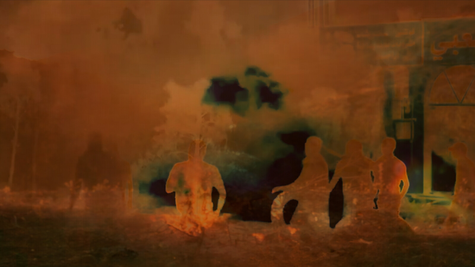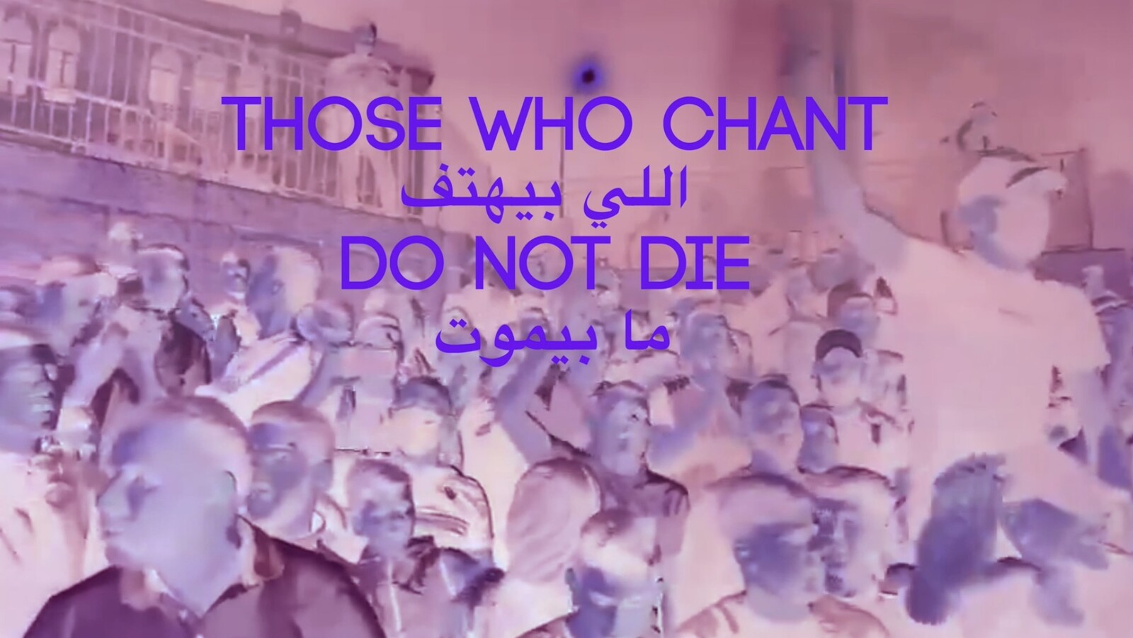 A third of the way in, the tempo of the video changes. Drumming starts reflecting the Arabic dancing we see on screen, a thrusting beat that ramps up the sonic quality as the images become more frantic—joyful, angry, but above all determined. “The fire / raged and raged / until we became fire,” reads the text. A couple dances, then a crowd. The lives of those killed at Tantura memorialized in music, but their suffering has not gone away. A man appears muttering incantations while pacing across a sandy wasteland: a fugitive, the subtitles suggest, who has been “dragged from prison to prison,” who can’t walk the streets of Jerusalem in case he is asked for his ID. In the closing frames, this lone figure is replaced by a crowd. The subtitle reads: “those who chant do not die.”