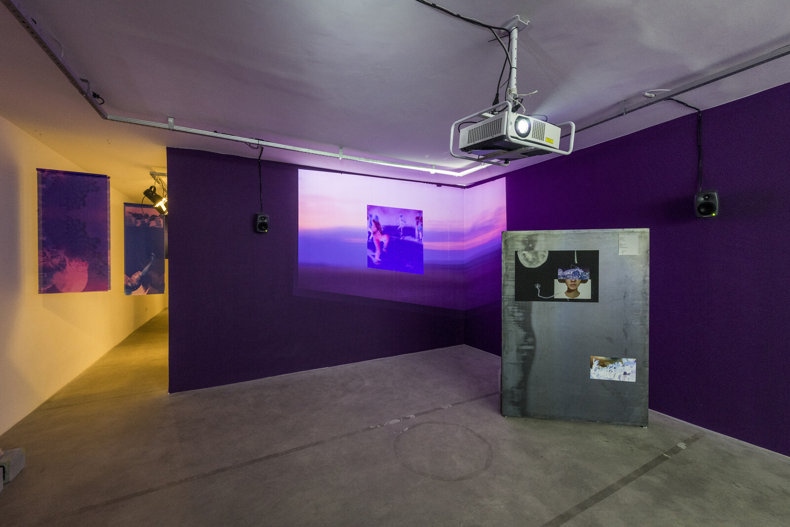 The deep boom of a subwoofer meets you on the stairs to the small gallery. Inside, a two-channel video projected across opposite walls shows barren landscapes with figures moving through them, close-ups of plants and foliage, and more besides, the imagery by turns sped up, slowed down, color-adjusted, and layered. One half is framed to the dimensions of the space; the second is projected at an angle, so the pictures invade the ceiling and floor. It is a hypnotic, unnerving assemblage.
