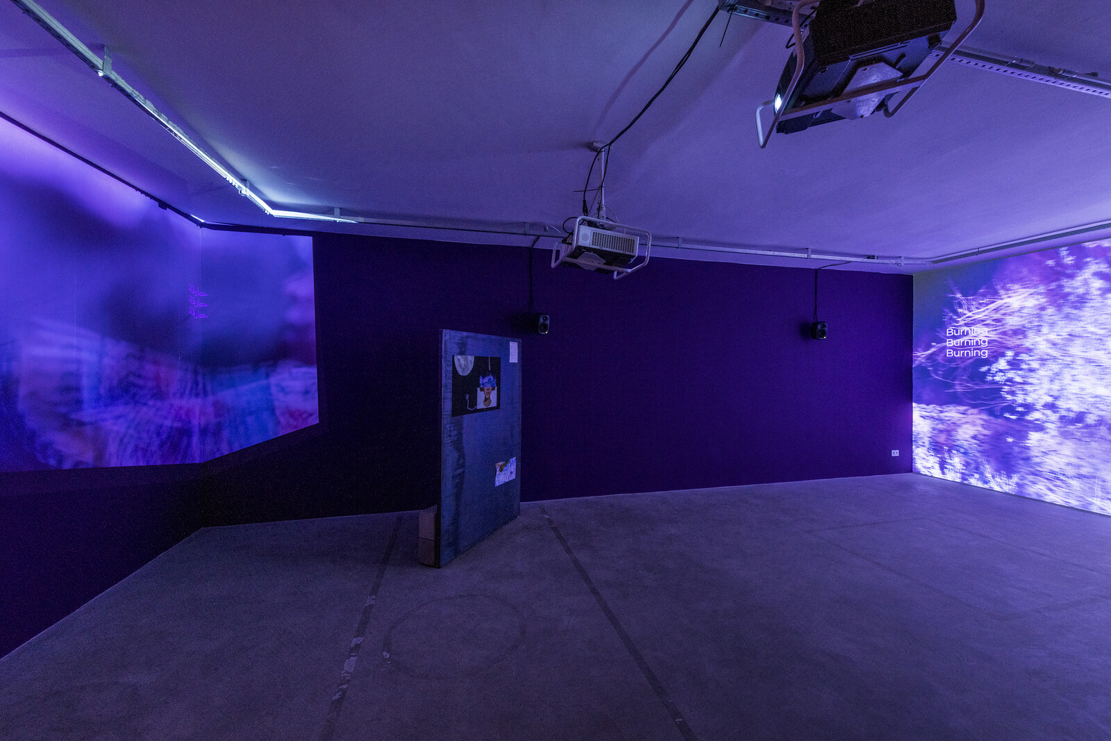 The materiality of all this stuff is in stark contrast to the subject of the thirty-two-minute, mixed-media work that lends this exhibition its title: the brutal erasure of the village of Tantura, a Palestinian fishing village, by Israeli forces during the Nakba, in 1948. As many as 200 of the village’s residents are believed to have been massacred; those who survived were expelled from the settlement.1 Basel Abbas and Ruanne Abou-Rahme’s work traces the total dematerialization of a community, its presence left only to memory, and reveals a landscape burned to the ground, cacti sprouting where once people lived. “The land will testify,” read the fragmentary text that subtitles the film, in purple English and Arabic text. “Where there is violence there is always a trace. An echo buried.” The video pans to the beach and car park where the village once lay. The aerial footage appears in negative, like an x-ray of a modern settlement beneath which trauma lies.