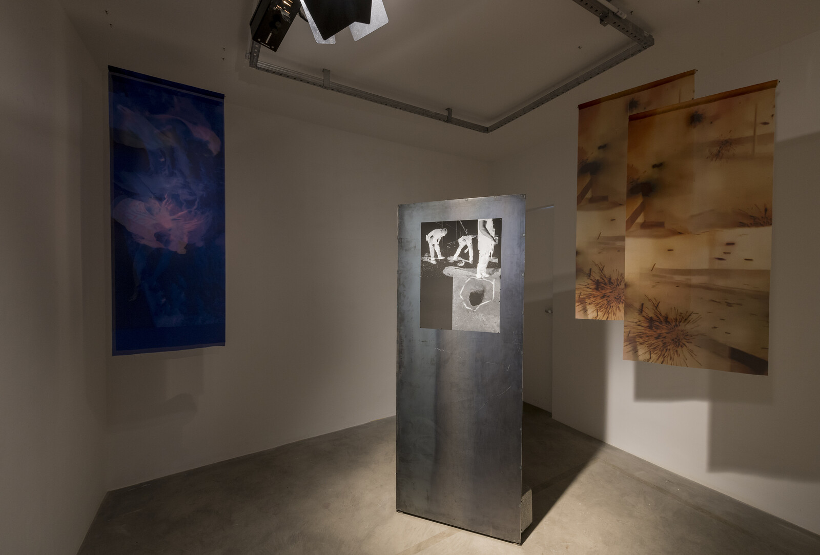 On the gallery floor, between the two projections of Until we became fire and fire us (2023–ongoing), stand metal barricades, like sections of a security border, on which printed frames from the film are attached. Above, sheer fabric banners hang, printed from further images culled from the video. To one side, copies of a newspaper—the New York War Crimes, mimicking the design of the New York Times—are piled up on a pair of bricks and available for the visitor to take away. It tells a century-old story of Palestinian struggle and Israeli aggression through a succession of commissioned texts.