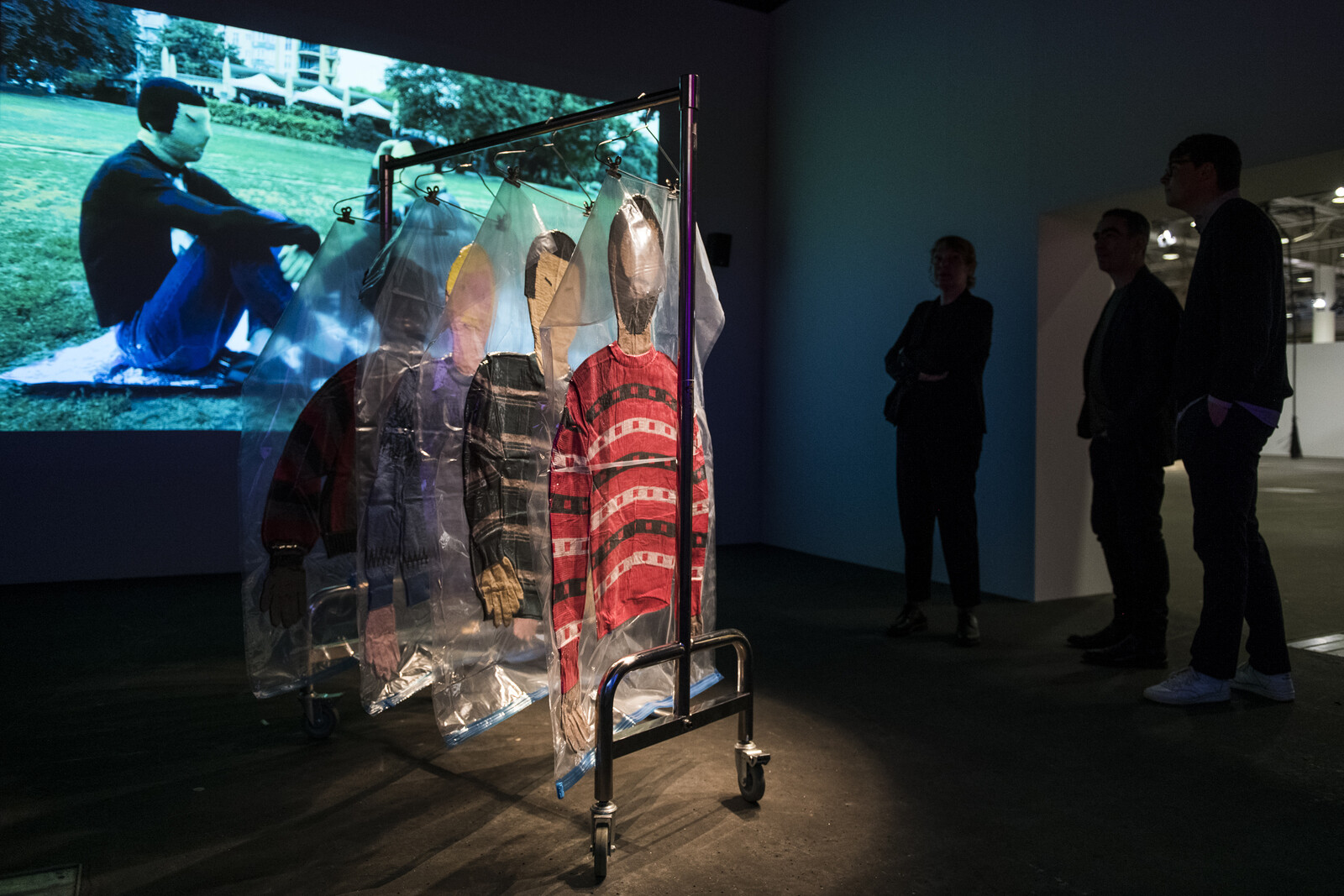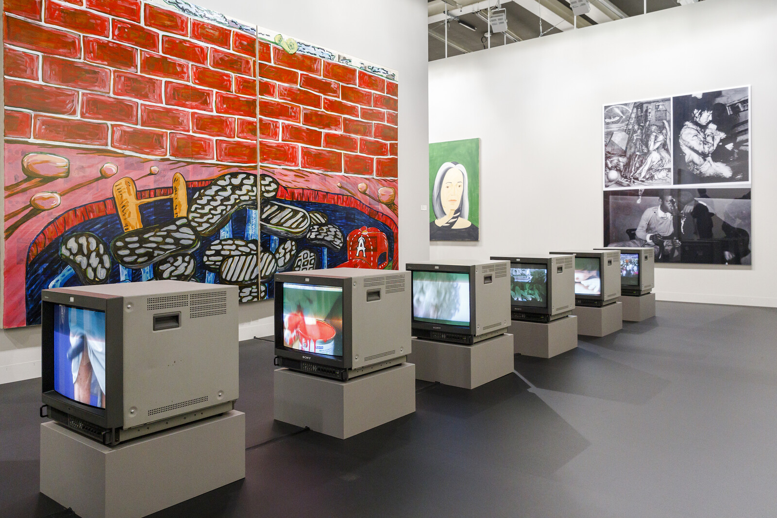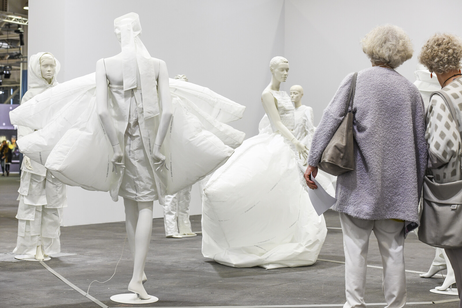 Art Basel presents itself as a fair with the solidity of an artwork. Its size and rough number of exhibitors have been fixed since 1975. Many exhibitors retain their booth every year at the same spot and keep wearing suits from the same tailor they discovered when their business took off. The different sections of the fair haven’t changed in years, nor has the beige carpet. Art Basel exerts change only in its efforts to subdue it. This year, the fair carried out two major measures of that kind. First, it introduced progressive pricing—the bigger the booth, the more expensive per square meter it gets—to subsidize smaller galleries and prevent the fair from being left to the mega players. Second, it made an effort to include more female artists. This becomes clearer in Unlimited, the curated section that features big sculptures, installations, and videos. Centerpieces at the entrance and in the middle of the section were by women. A concern for women’s rights was underlined by Andrea Bowers’s Open Secrets Part I & II (2018–19), a monumental documentation of cases of sexual misconduct revealed by the #MeToo movement; a huge sculpture by Coco Fusco that ridicules Donald Trump as the Tin Man of the Twenty-First Century (2018); and LifeDress (2018), outfits by Alicia Framis made from partly inflatable airbag fabric to protect women against physical harassment.