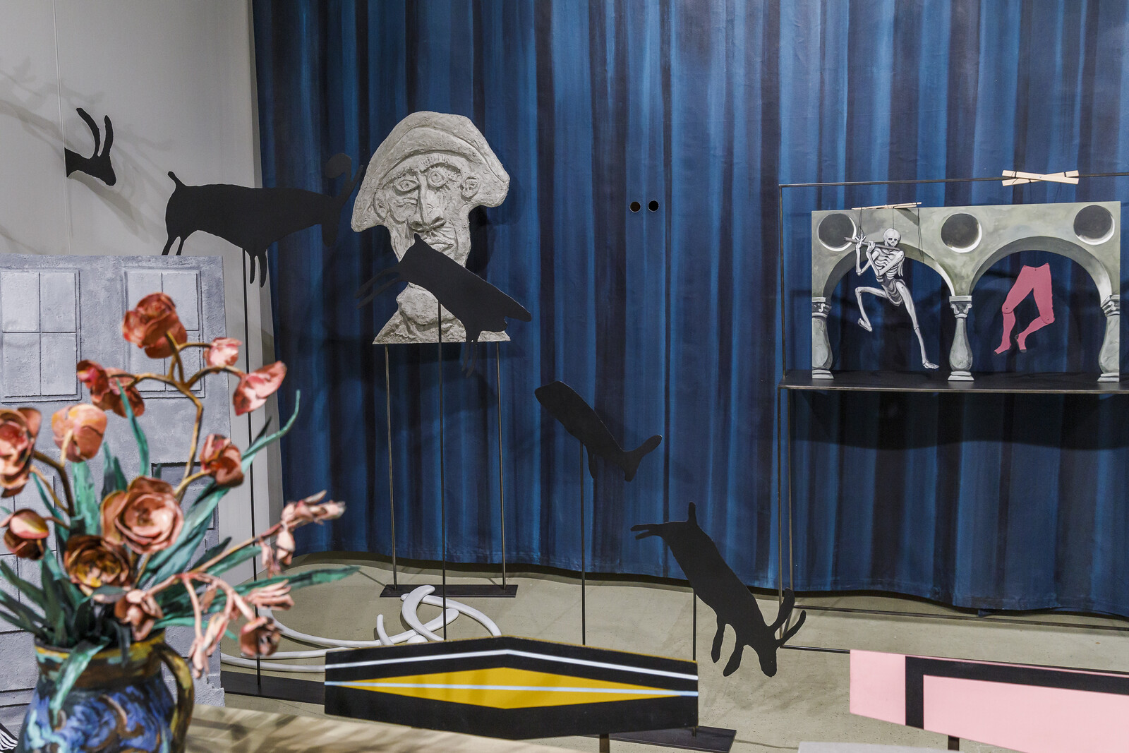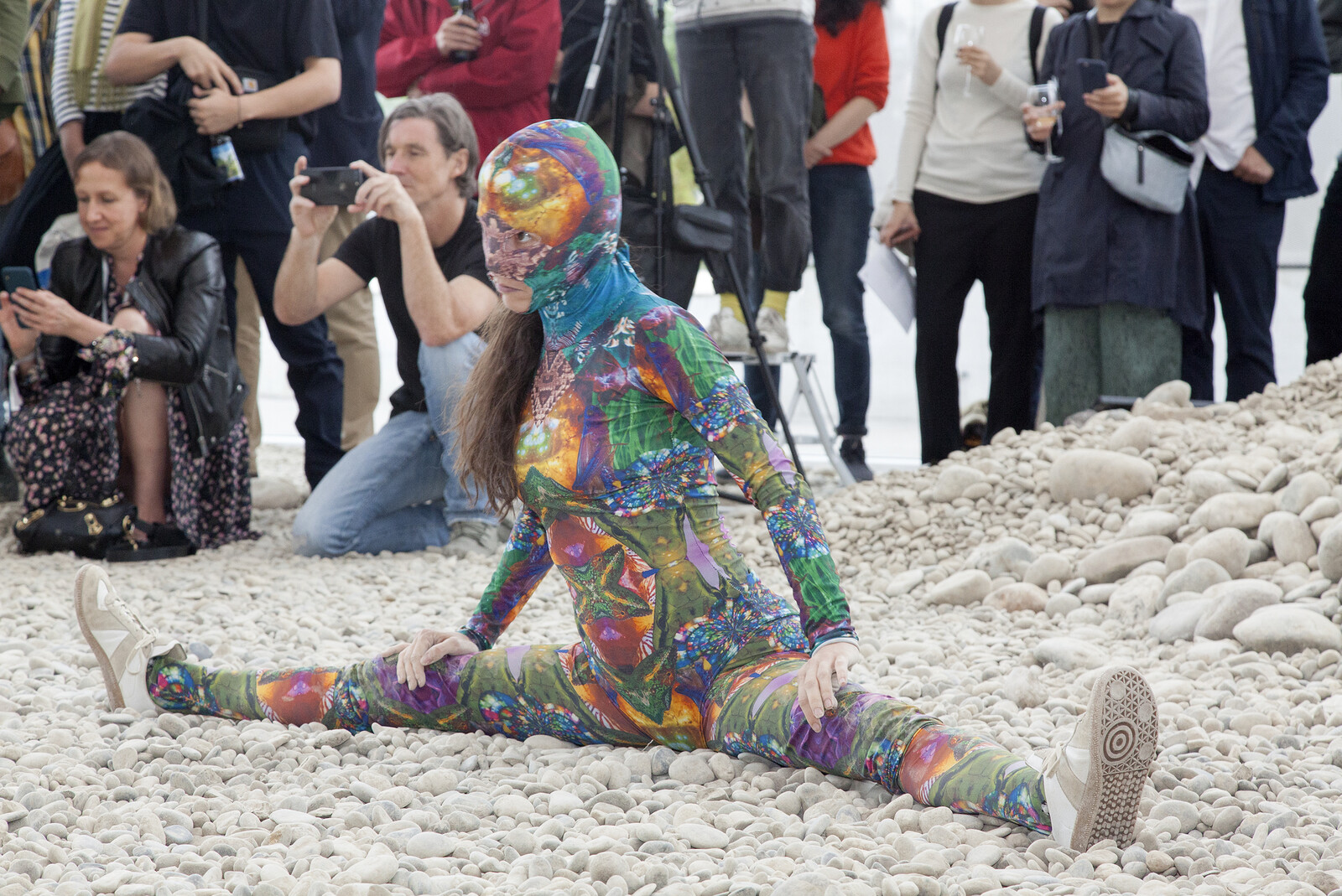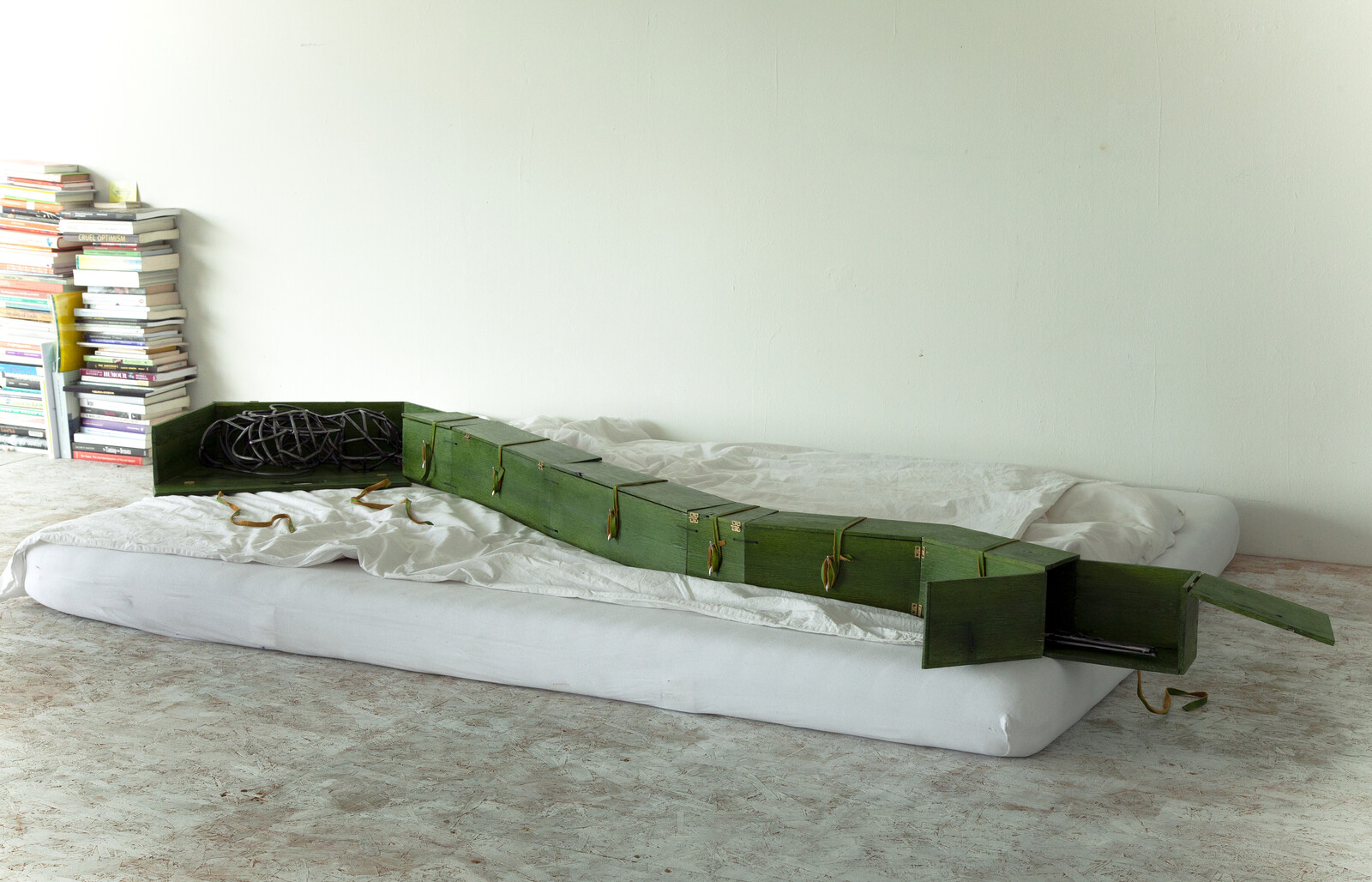 The Art Basel week offered some glimpses of this new reality. At Unlimited, Marc Brandenburg put a couple of Camouflage Pullovers (2018) on a rack: knitted sweaters that cover wearer’s hands and faces with hands and faces in different skin colors. At her Kunsthaus Baselland retrospective exhibition, Simone Forti presented her famous performance piece Huddle (1961), in which a group of people lean against and crawl upon one another in ever-changing ways. In Institut Kunst’s Der Tank, choreographer Cecilia Bengolea ended her dance piece Oneness (2019) by inviting the audience to join her in a dizzying Sufi dance on a dry, rocky seabed. For her exhibition project Rheum, artist Cassidy Toner takes a more casual approach to post-visual art. For the last year, she has been sharing her bed with specially commissioned artworks. This time, Chris Domenick and Em Rooney fabricated sleep when you’re dead: a slim coffin for a snake-like iron skeleton that meanders diagonally over Toner’s king-size mattress. Her romantic partners and little street dog somehow manage to fit in. Bridging visual and non-visual art, Toner explores how conventional, object-oriented art can also be perceived intimately, without wasting any space.