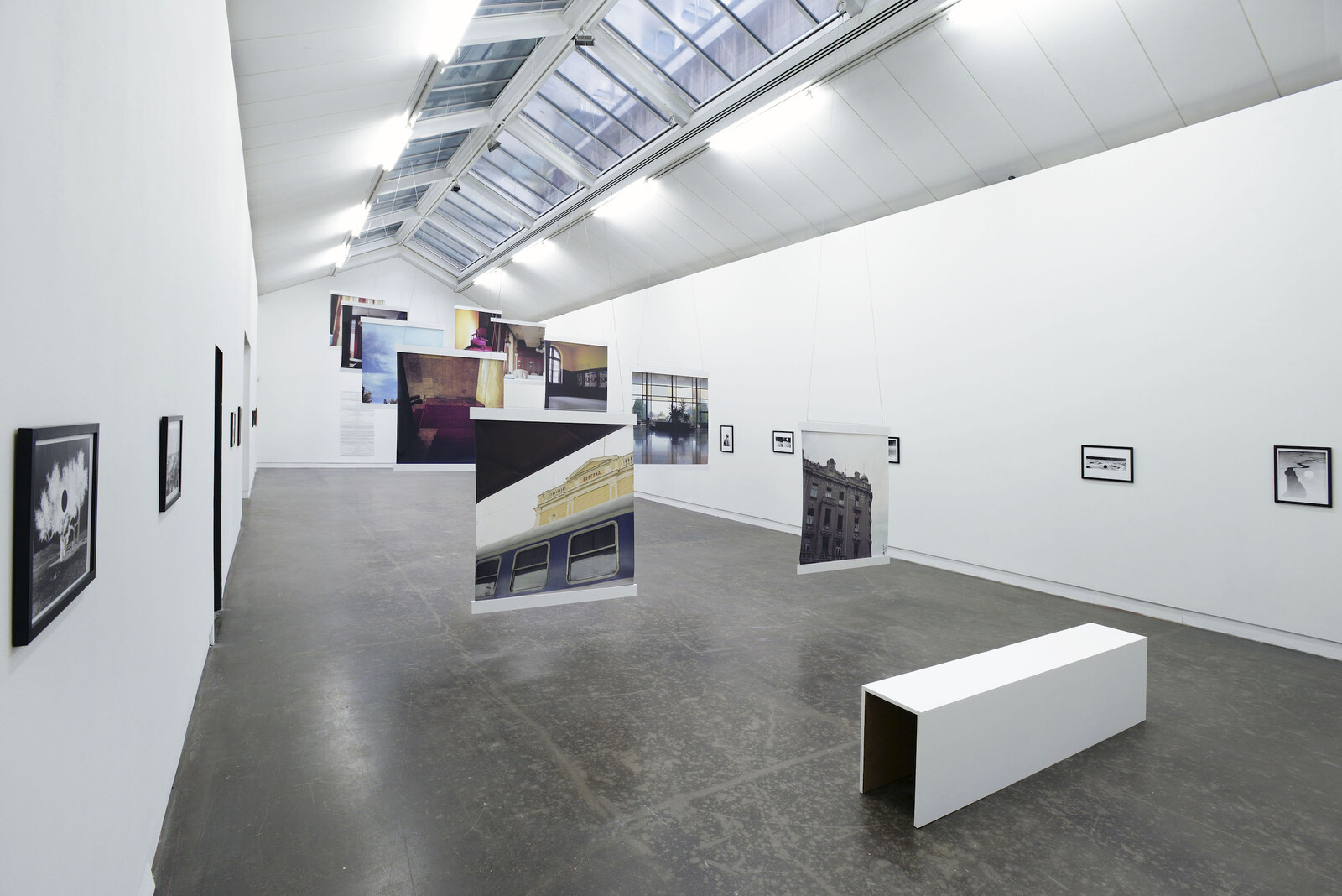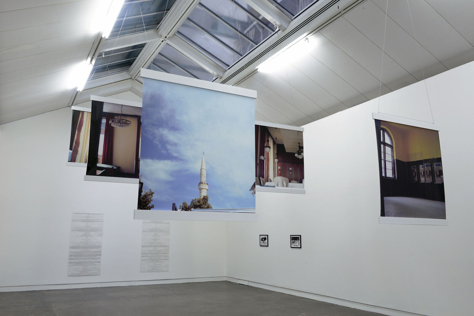 On view in the main gallery are photographic banners hanging from the ceiling, framed archival prints, and a sound piece of a woman speaking in Arabic. It is, however, imagery conjured by the written word that forms the axis around which the exhibition’s real and imagined stories revolve. The first gallery space has been turned into a reading room where viewers are invited to sit down in an armchair or on cushion-strewn floor mattresses with A Philistine (2019), a novella by Alsharif. Written in English and translated into Arabic in a Palestinian dialect, it follows a young woman named Loza as she moves from present-day Lebanon through Palestine in 1935, the year before the Arab Revolt against British rule began, and into ancient Egypt. The book cannot be bought or taken home; it takes around an hour and a half to complete in English, and it can only be done in the gallery. For the artist, the context in which the story is read is as important as the act of reading itself. Experiencing it in situ, explains Alsharif, emphasizes the functional, social role of the gallery space while also, in a gently coercive way, encouraging viewers to spend time with the story’s journey as it passes through “the highly fractured landscape of the Middle East and North Africa.” Alsharif believes this will help readers “to imagine what has been obsolete and what can be reversed again.”1